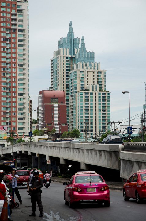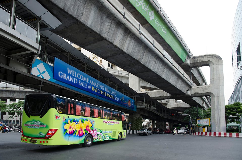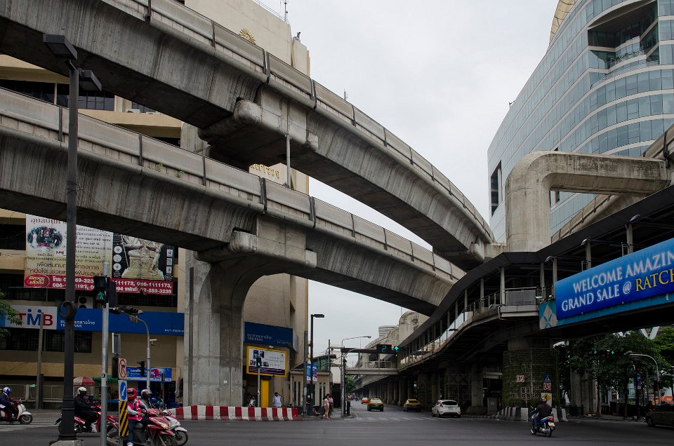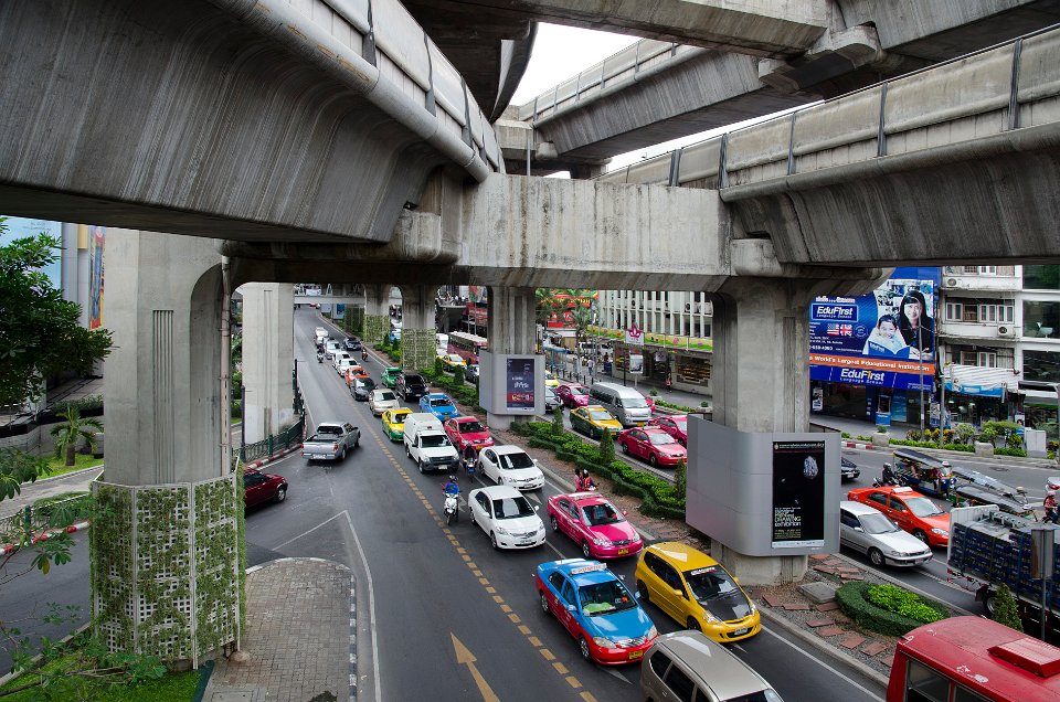 DSC 0935  Les voies aériennes du Sky Train près de Siam Square DSC 0938  La station du Sky Train de Ratchadamri DSC 1088  Le Sky Train étant ses voies en béton au-dessus des avenues DSC 1106  La voiture reste le mode de transport le plus utilisé et fait de Bangkok une ville très polluée