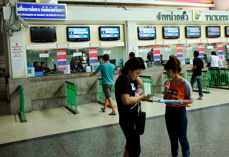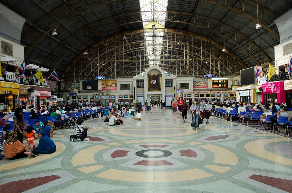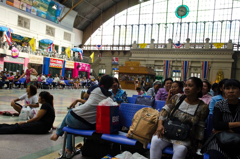 DSC 1126  La police n'est pas très présente et c'est la loi de la jungle qui règne en matière de circulation DSC 1129  Mais ce moyen de transport, peu cher (maxi 1/2 €) est assez rustique DSC 1825  Les guichets de la gare de Hua Lamphong DSC 1826  Le train n'est pas cher, moins de 1€ pour aller à Ayuthaya, mais il faut savoir attendre
