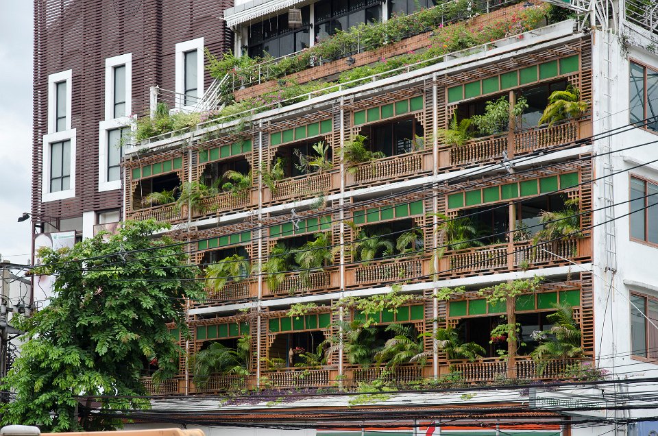 Un immeuble vert de l'avenue Petchburi