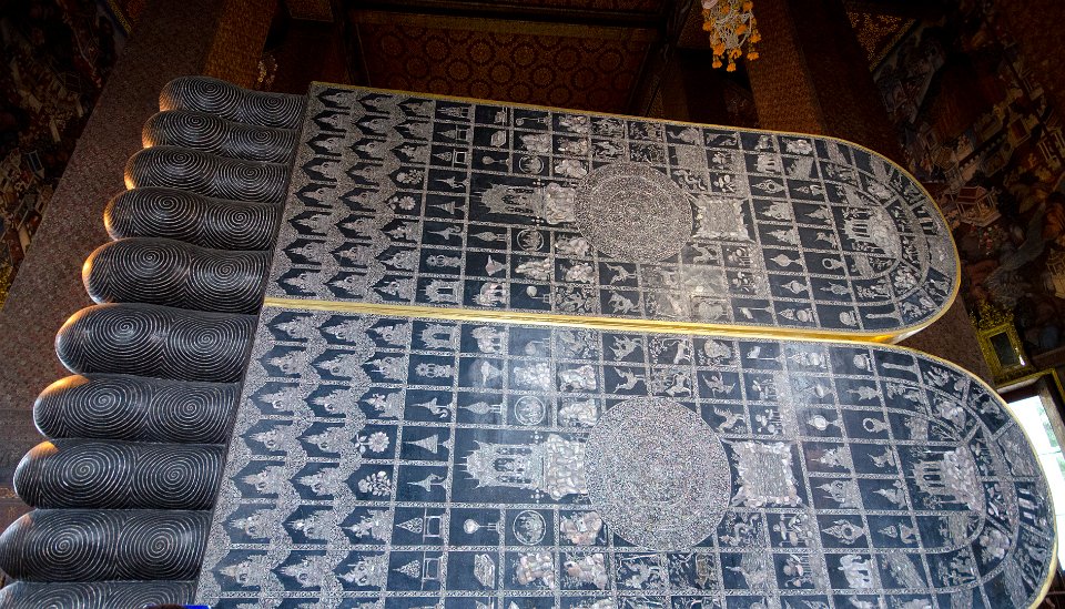 Sur la plante des pieds, les peintures représentents les 108 états du Bouddha