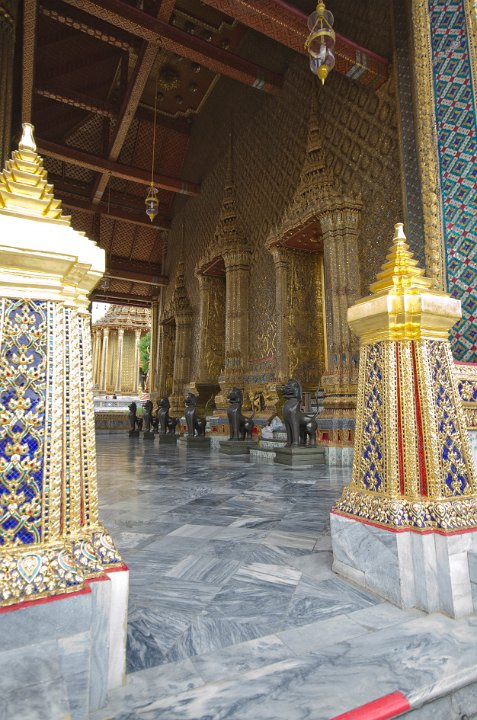 DSC 1171  Porte sculptée et dorée DSC 1227  Les mosaiques DSC 1249  Les clochettes qui agitées par le vent créent une ambiance sonore particulière DSC 1251  Sanctuaire entouré d'éléphants