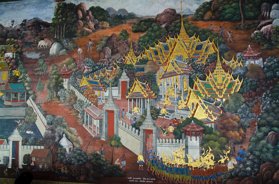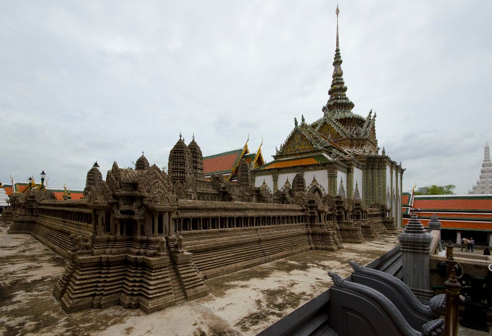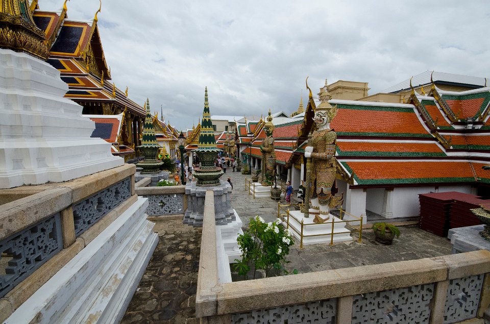 DSC 1205  Bot du bouddha d'Emeraude DSC 1207  Maquette du temple d'Angkor Vat DSC 1215  Vue d'ensemble avec les géants du Ramakien DSC 1224  Bot du Bouddha d'Emeruade et la galerie du Ramakien à gauche (fresques)