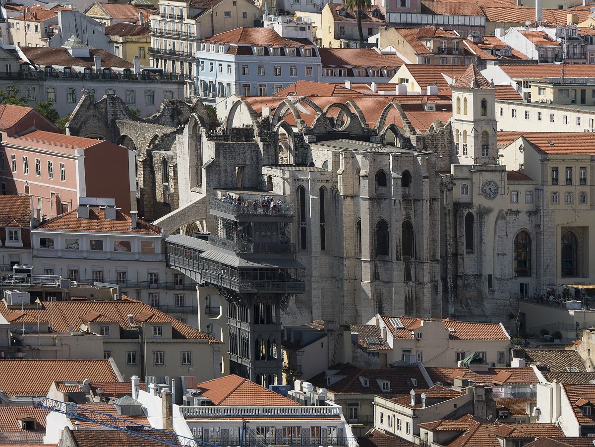 Le couvent des Carmes vu depuis le chateau Saint Georges dans son environnement urbain (à côté, l'ascenseur de Santa Justa)