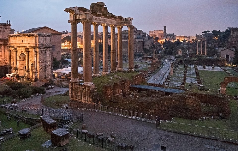 25Au premier plan, Arc de Septime Sévère et Temple de Saturne au soleil couchant