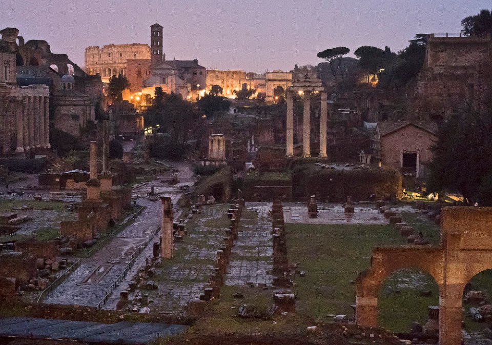 26Vue nocturne . Au premier plan la basilique Emilia et derrière Le temple de Castor et Pollux