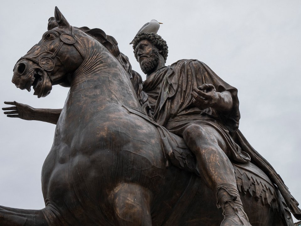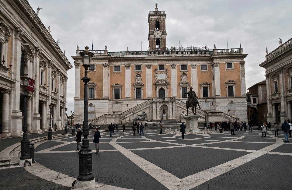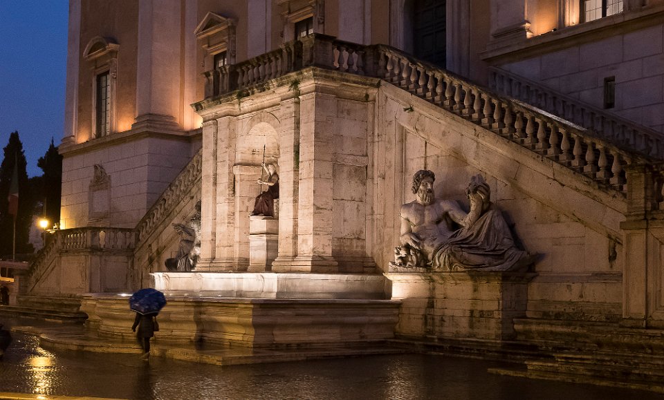 Escaliers du monument à Victor Emmanuel Escalier d'accès  au Capitole conçu par Michel-Ange, et statues de Diocures Le Capitole Statue équestre de Marc Aurèle (copie)