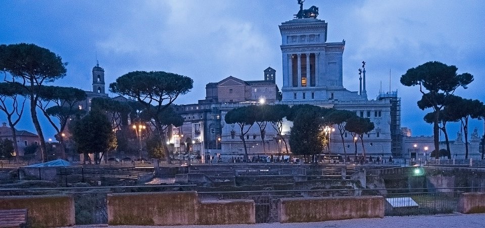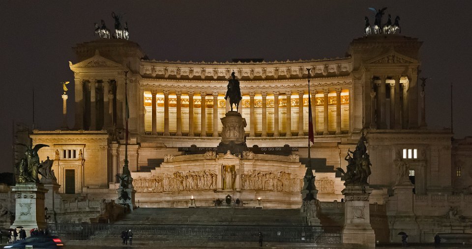 Monument à Victor Emmanuel de jour vu du forum de Trajan Et de nuit Monument à Victor Emmanuel- façade à colonnesl Vue nocturne du onument à Victor Emmanuel