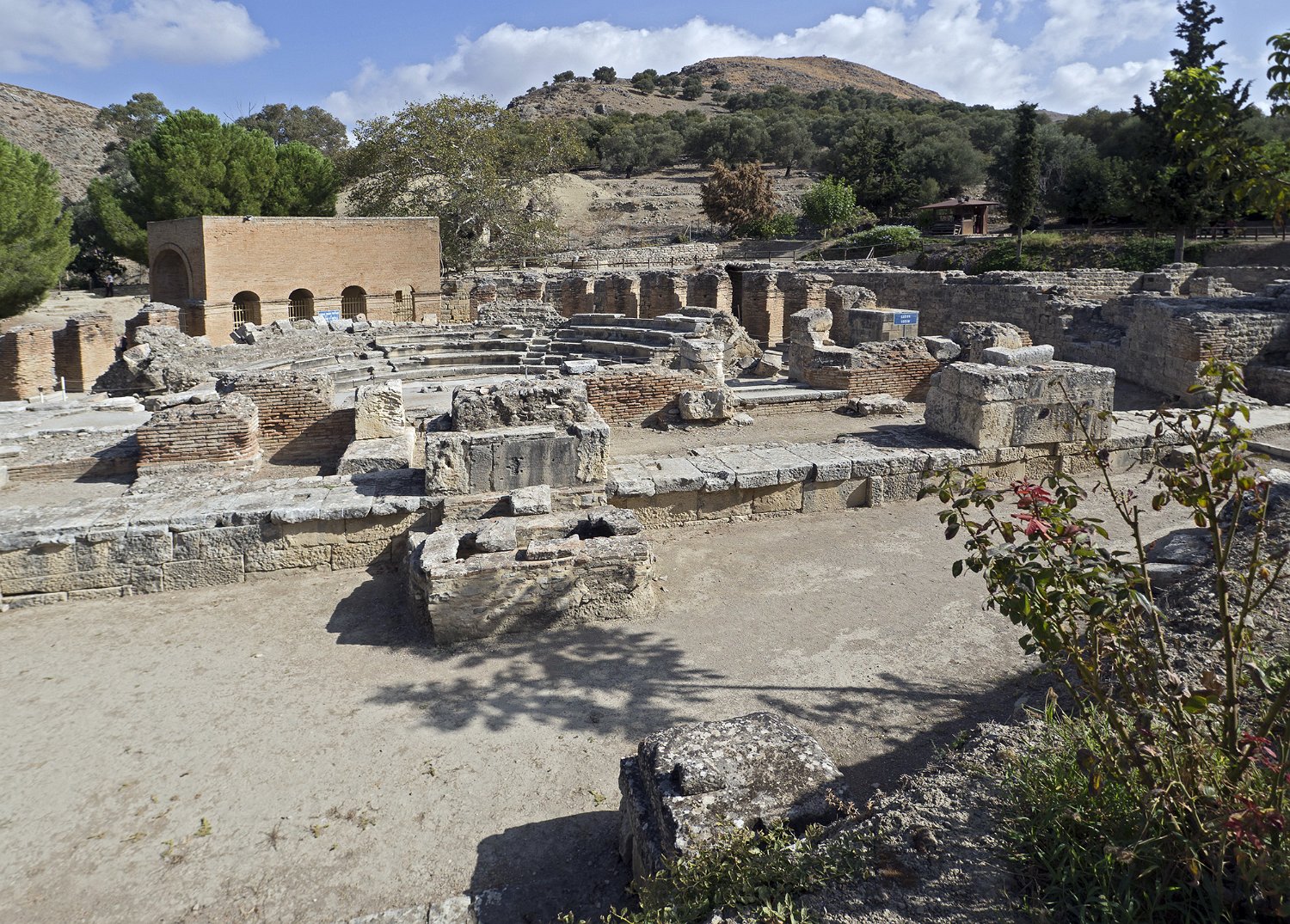 5L'odéon L'Odéon se compose de trois parties principales : La Cavea avec ses gradins et escaliers, l’orchestra, d’un diamètre de 8,5m était dallée de plaques de marbre blanches et bleues, et la scène rectangulaire surélevée. Reconstruit sous Trajan (1er siècle ap JC). C’est un théâtre romain typique.