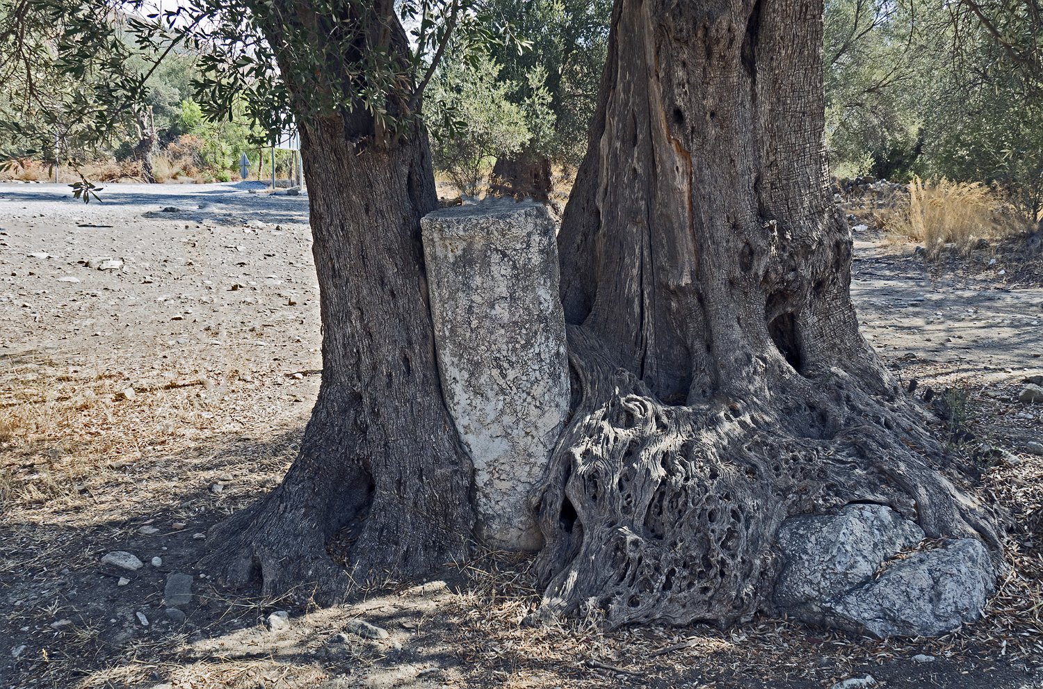 11Colonne prise dans les racines d'un olivier Des oliviers séculaires, connus sous le nom de "frankoliès", sont disséminés sur tout le site archéologique de Gortyne.
