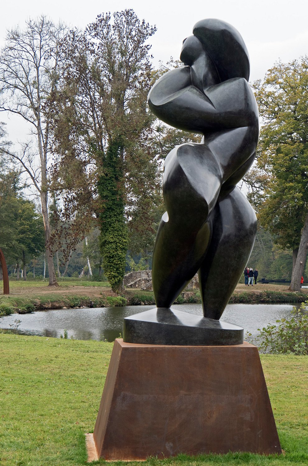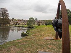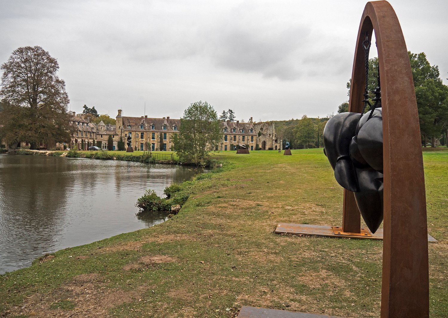 Vue d'ensemble de l'abbaye depuis l'étang. Au premier plan une sculpture de Pollès.