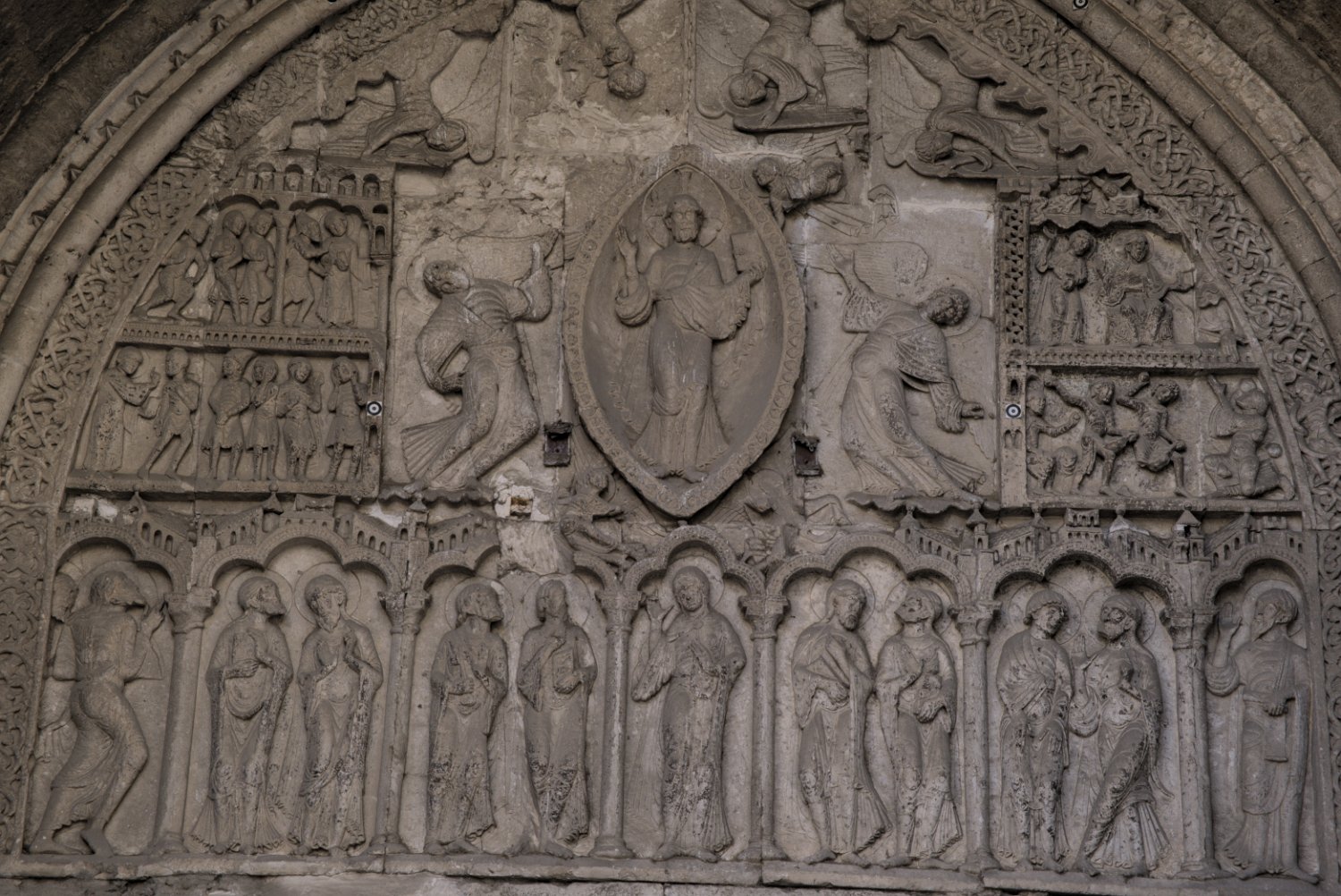 Le tympan du portail nord  Il est dédié à l'ascension du Christ et au martyre de Saint Etienne