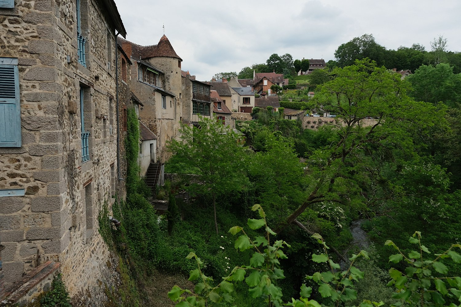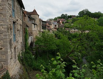 Maisons construites sur la falaise qui surplombe la rivière Gargilesse, affluent de la Creuse