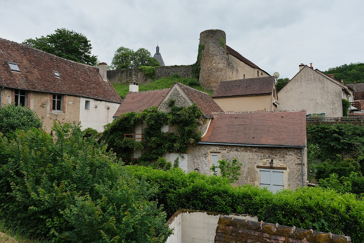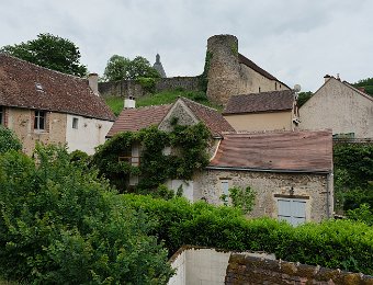 Vue du village- En haut le pigeonnier, rempart et bâtiments du château