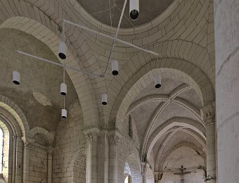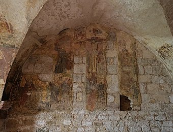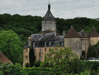 Cour intérieure du château- Le château (à gauche) et l'église romane