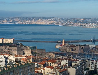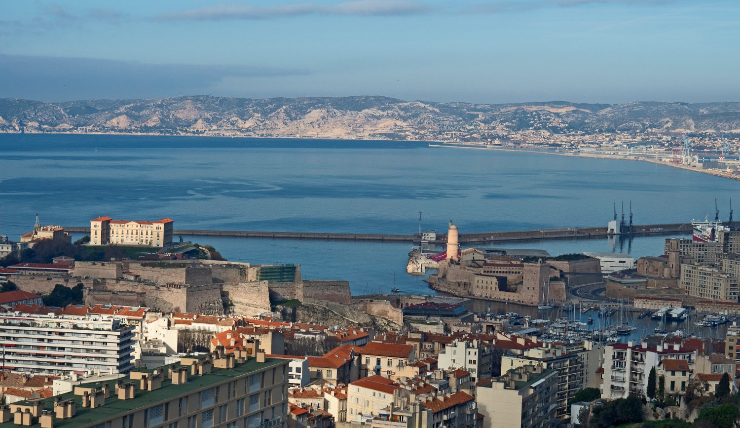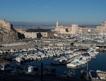 Les deux forts de défense de l'entrée du vieux port vus depuis le point de vue de l'Abbaye Saint Victor : à droite le fort Saint Jean et à gauche le fort Saint Nicolas