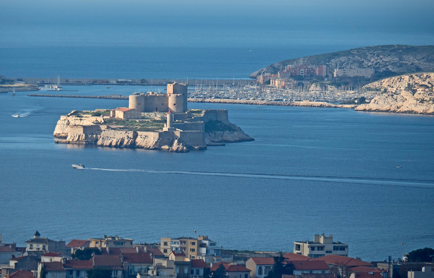 Les deux forts de défense de l'entrée du vieux port vus depuis la rade : à gauche le fort Saint Jean et à droite le fort Saint Nicolas