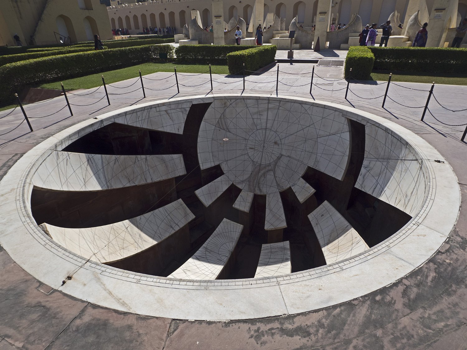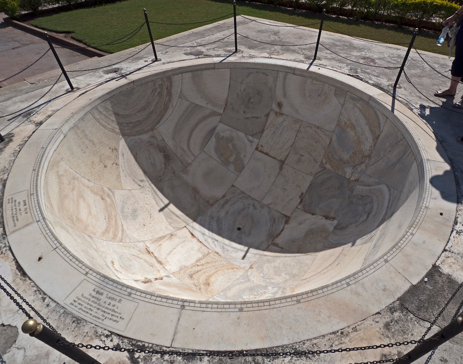 7Le Jai Prakash Yantra Cet instrument permet de suivre la course du soleil dans le zodiaque. Le petit disque percé suspendu au centre donne une image du soleil sur les plaques de marbre finement gravées.Chaque portion blanche correspond à une heure d'observation (il y a un 2ème instrument qui compense les "trou" de cette sphère). Les intervalles entre les portions permettaient à l'observateur une vision plus précise. Sous les plaques, des gradins permettaient de s'asseoir pour être plus à l'aise.