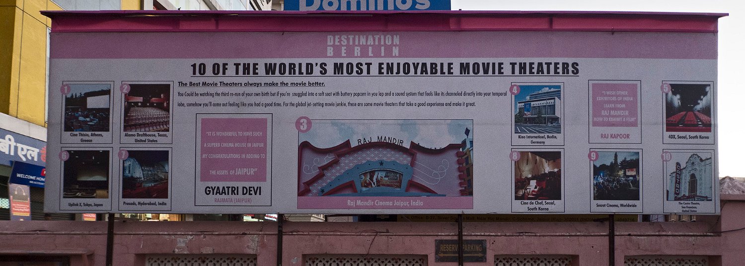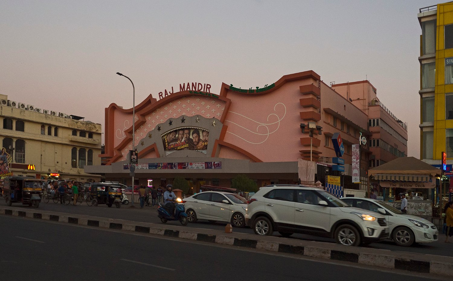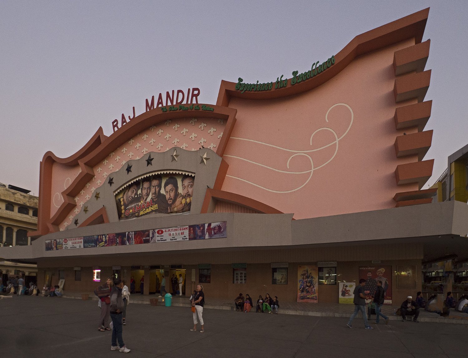 Le cinéma le Raj Mahal de Jaipur a été ouvert en 1976. Il peut accueillir 1200 personnes, et il est souvent bondé. Si l'architecture de sa façade est déjà remarquable, la décoration intérieure est fastueuse jusqu'à l'extravagance, que ce soit dans le hall ou dans la salle de projection. Mais le plus remarquable dans ce cinéma, c'est l'ambiance.Les indous "vivent les films" et accompagnent les acteurs de sifflets, d'applaudissements, et de rires qui paraissent un peu décalés au touriste qui ne comprend pas l'Indi.Le cinéma projette essentiellement des films made in Bollywood, nom donné à l'industrie du cinéma en Inde.