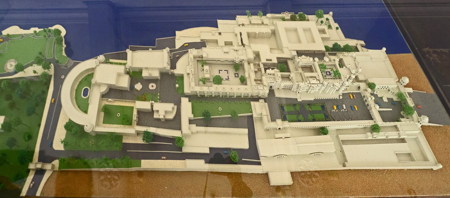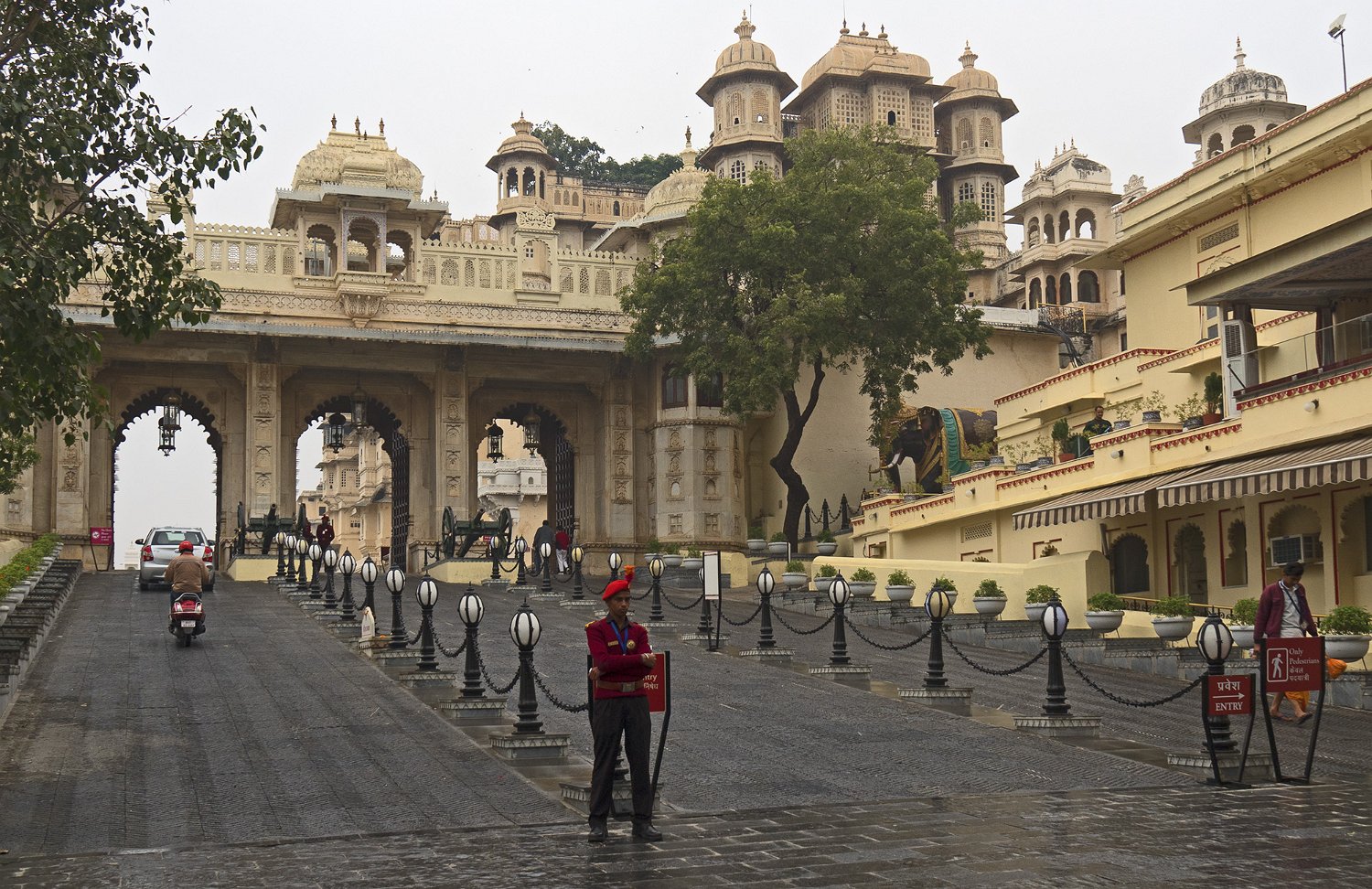 Le city palace vu depuis le lac Entrée du city palace (portes Tripolia)  Cette porte à trois arches a été construite en 1711 et donne accès à la grande cour (Manesh Chowk) City palace - vue d'ensemble de la façade depuis la Manesh Chowk. Complètement à gauche le Zenana Mahal (palais des femmes), au centre et à droite le Mardana mahal (Palais des hommes)  Image déformée issue de la fusion de 3 photos (le palais fait 250m de long, et est impossible à photographier dans son ensemble) Maquette du palais