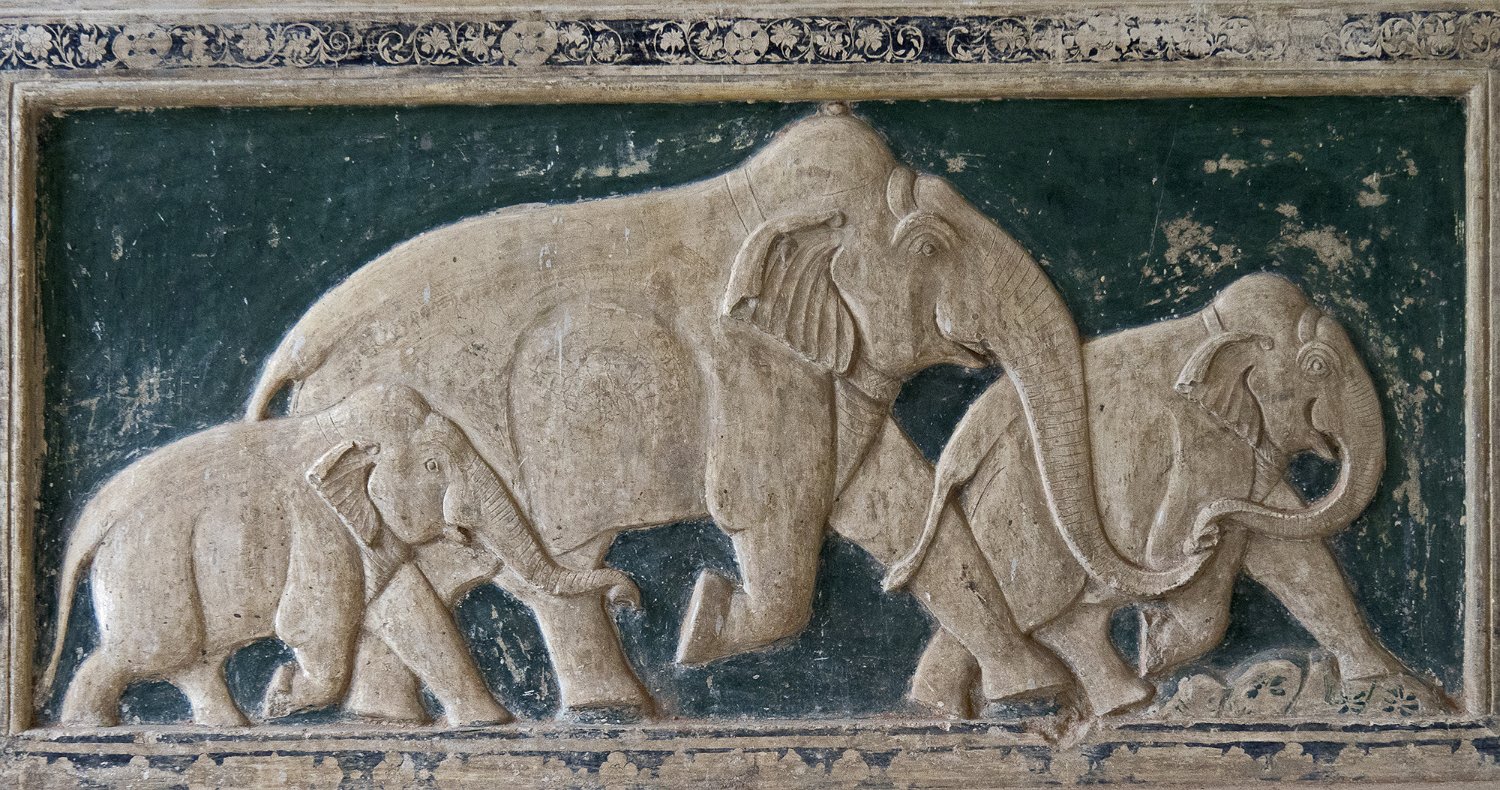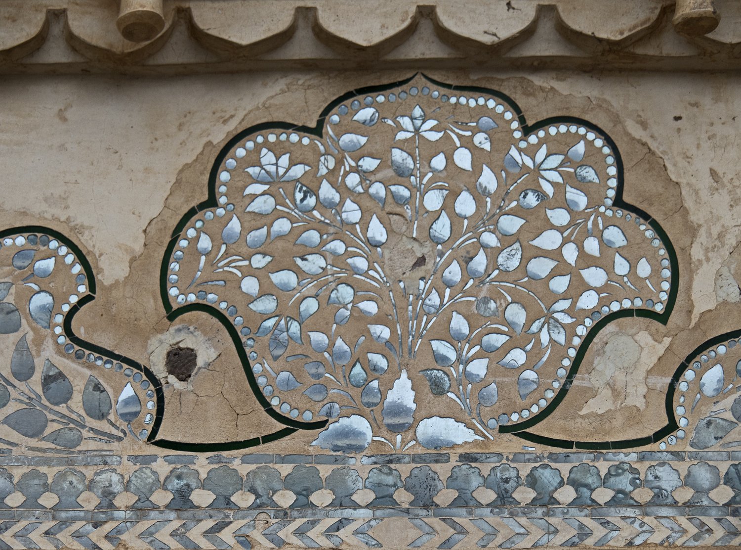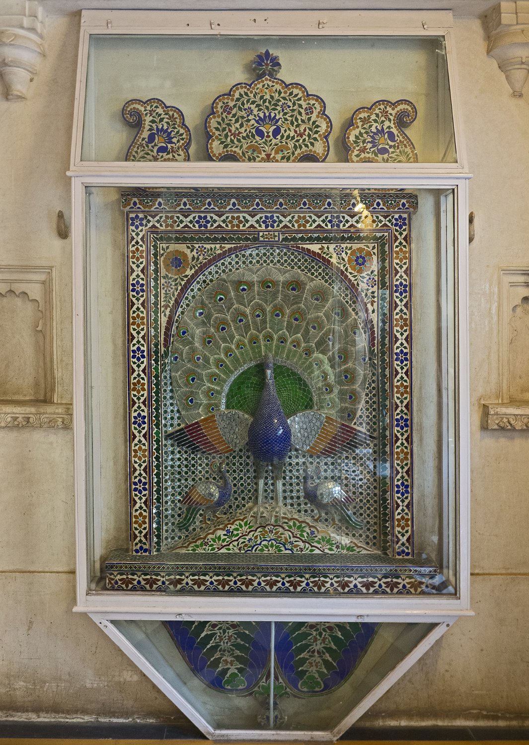 Zenana Mahal - la cour des paons  Le paon est à l'Inde ce que le coq est à la France Zenana Mahal - La cour des paons  Les trois paons représentent trois saisons de l'été, de l'hiver à la saison des moussons Zenana Mahal - Un des paons Zenana Mahal - Fenêtre décorée de mosaïques dans la cour des paons  Un magnifique mélange de styles architecturaux moghols et rajpoutes