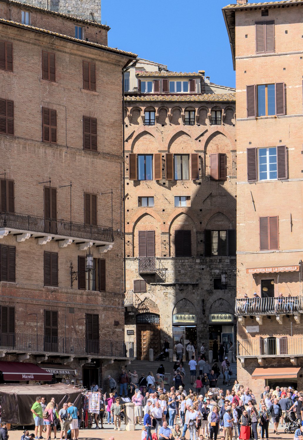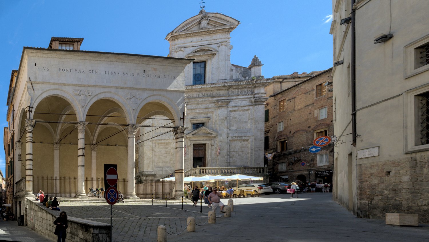 Les rues et les places de Sienne sont bordées loggias renaissance, de palais privés, d'églises baroques et de vieilles maisons en briques rouges. La Via di Città autour de la Piazza del Campo est la rue principale de Sienne avec de nombreux commerces.