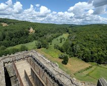 Vue sur la campagne environnante et le château de Laussel depuis le donjon