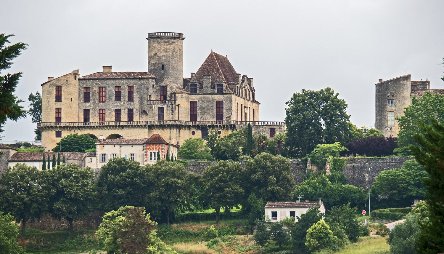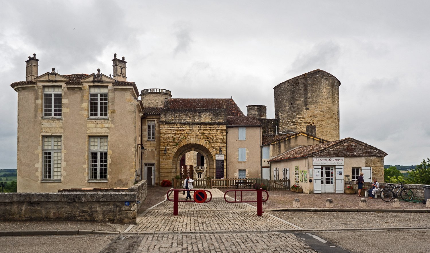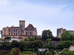 Le château de Duras sur sa colline vu de la chocolaterie Guinguet