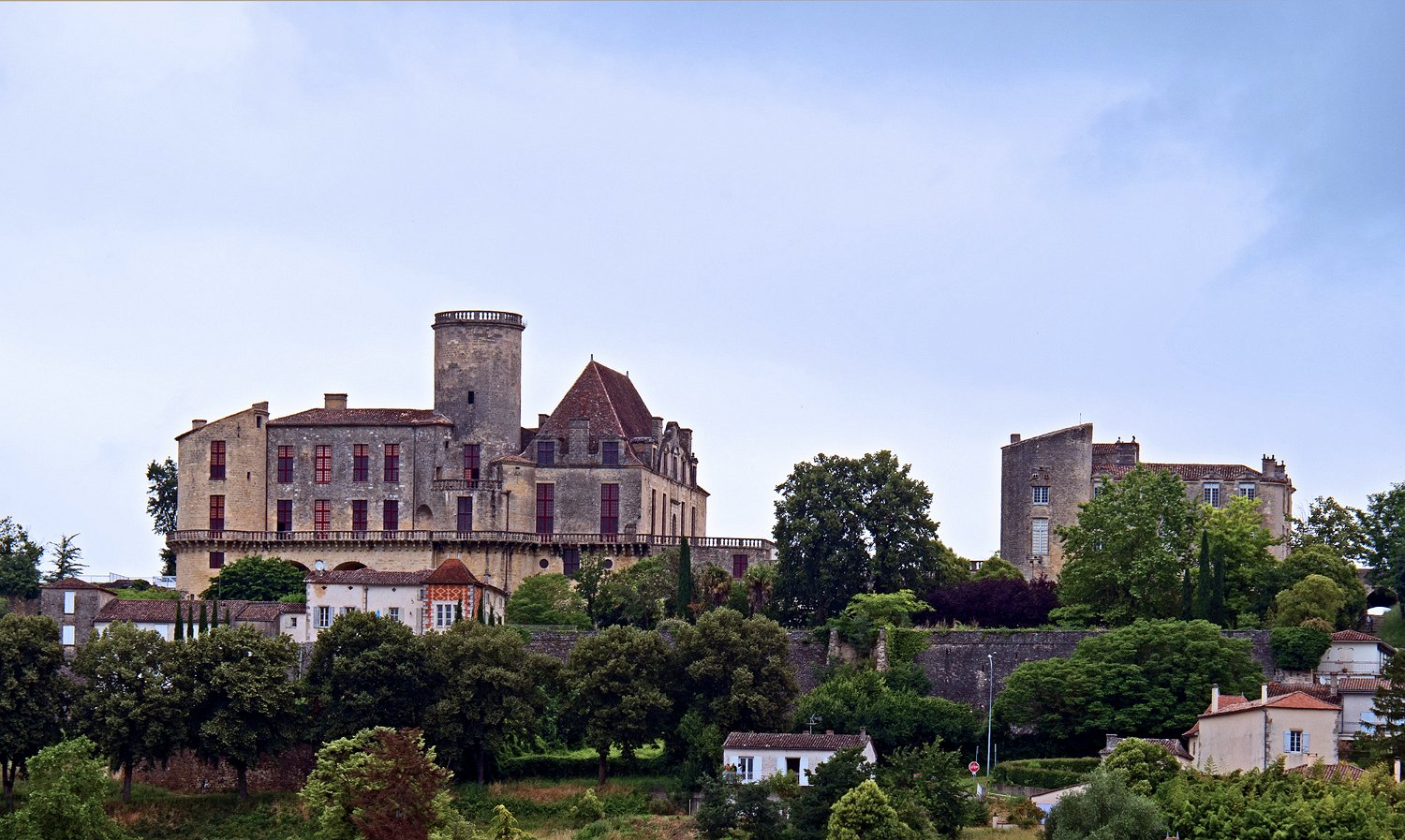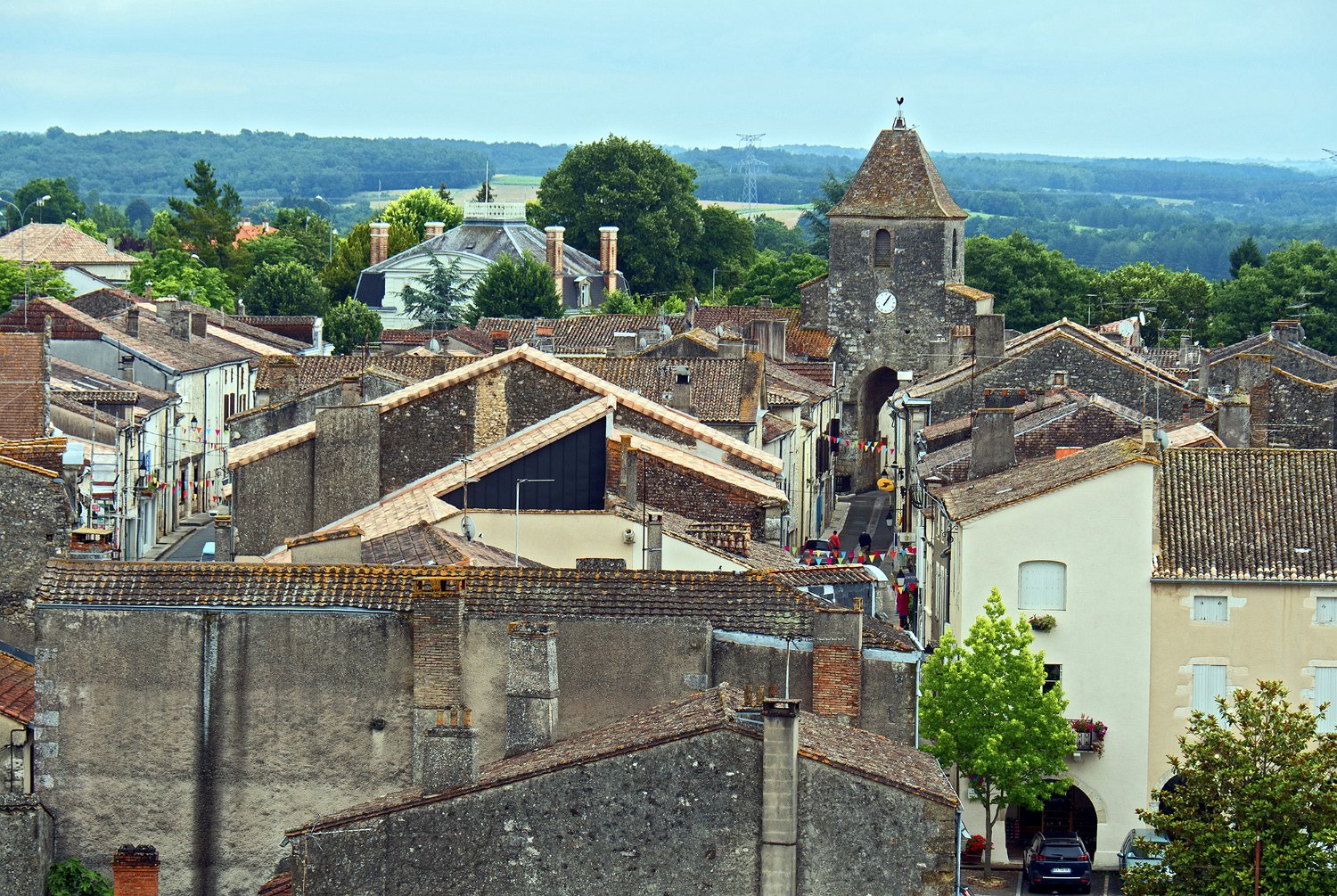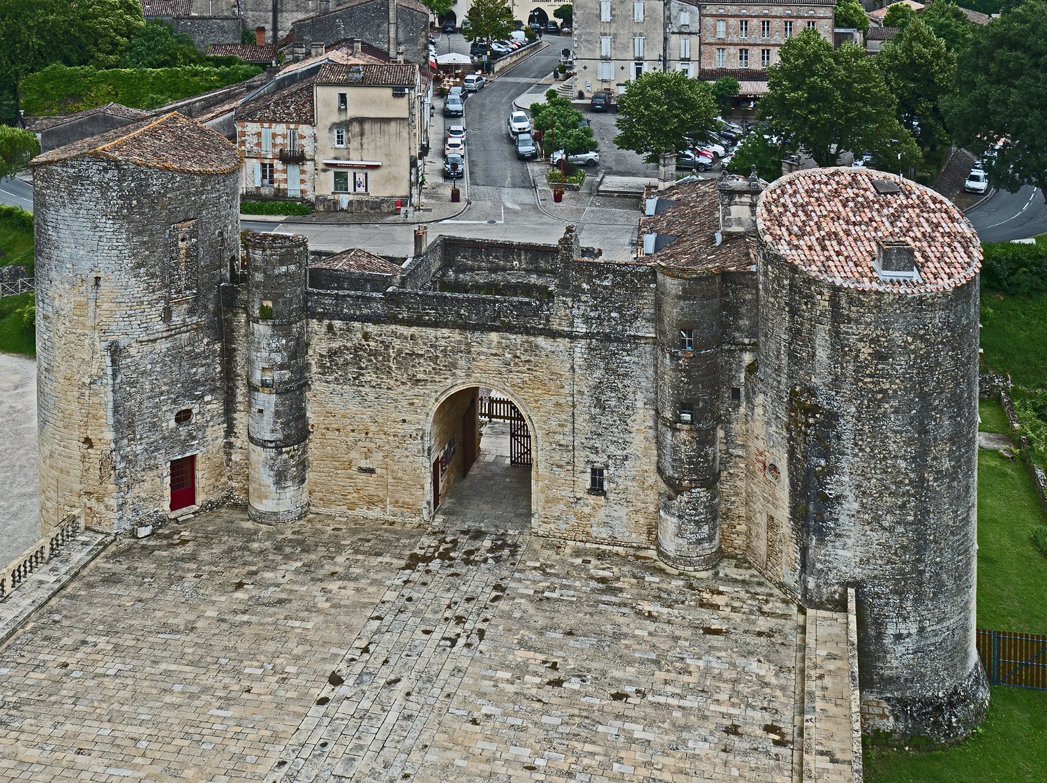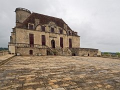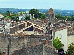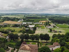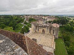 Vue de la toiture de l'aile des maréchaux, de la cour d'honneur et du petit château. Au fond le bourg de Duras
