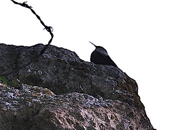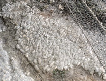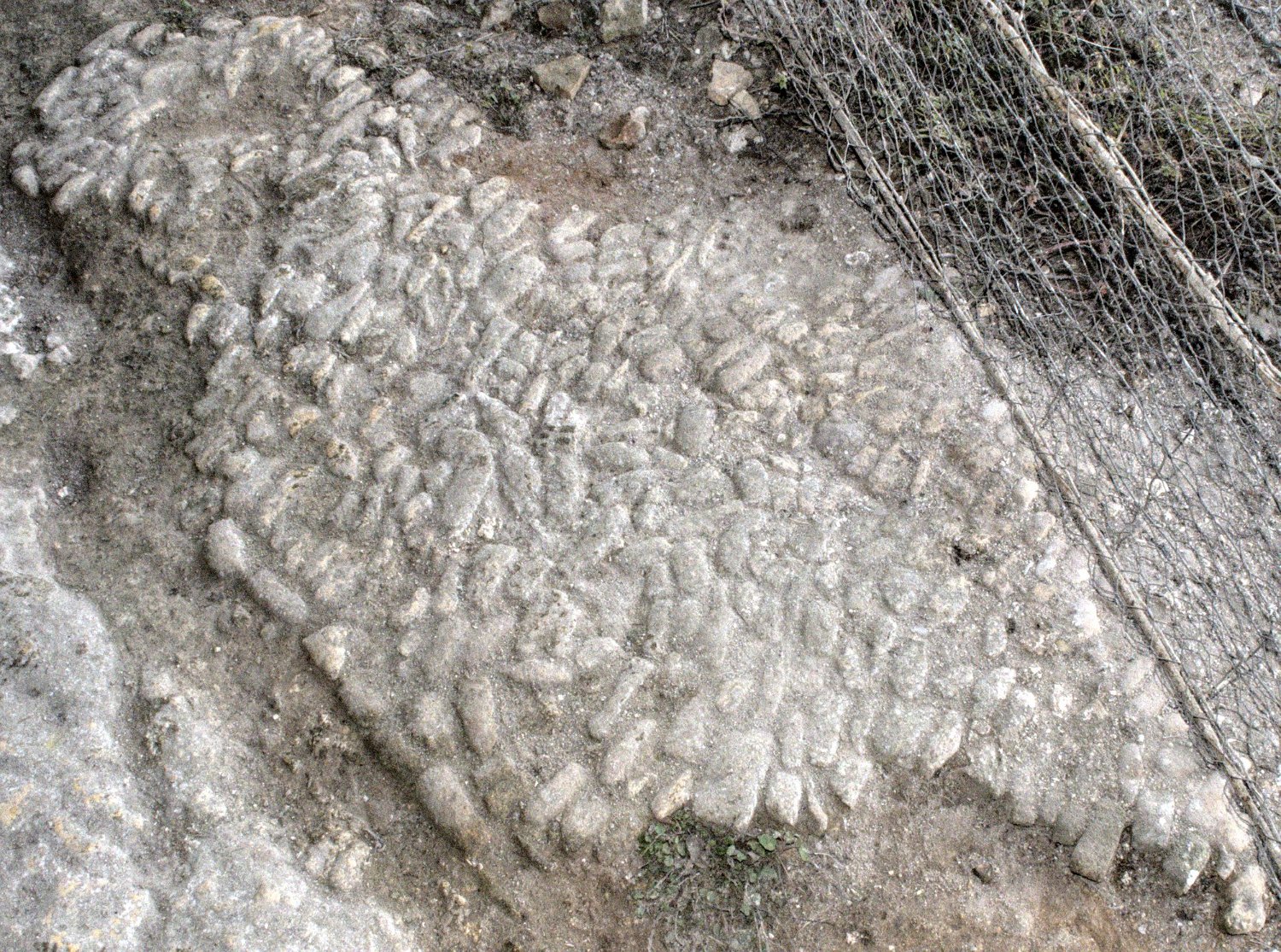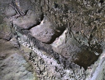 Vestiges de l'emplacement d'une toiture d'habitation («accent circonflexe» en haut à gauche de l'image) et de l'accroche d'un mur (rainure verticale en pointillé au 2/3 droit de l'image)