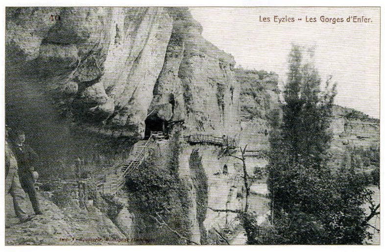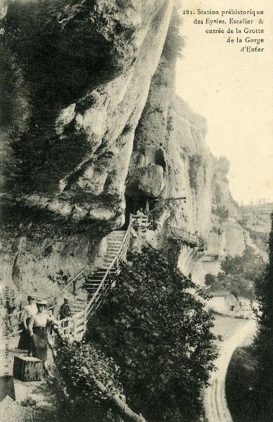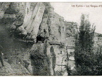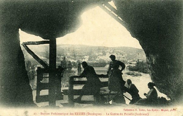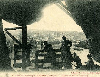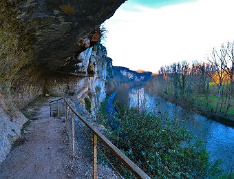 Vue sur la Vézère, les Eyzies et la terrasse du 1er niveau depuis l'entrée de la 1ère salle