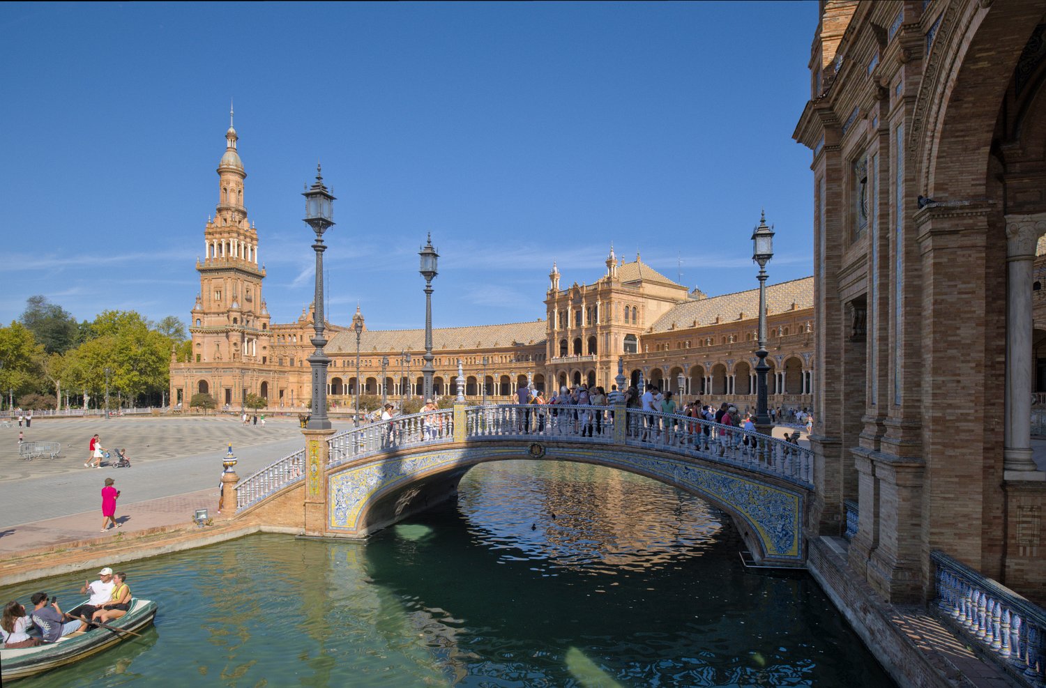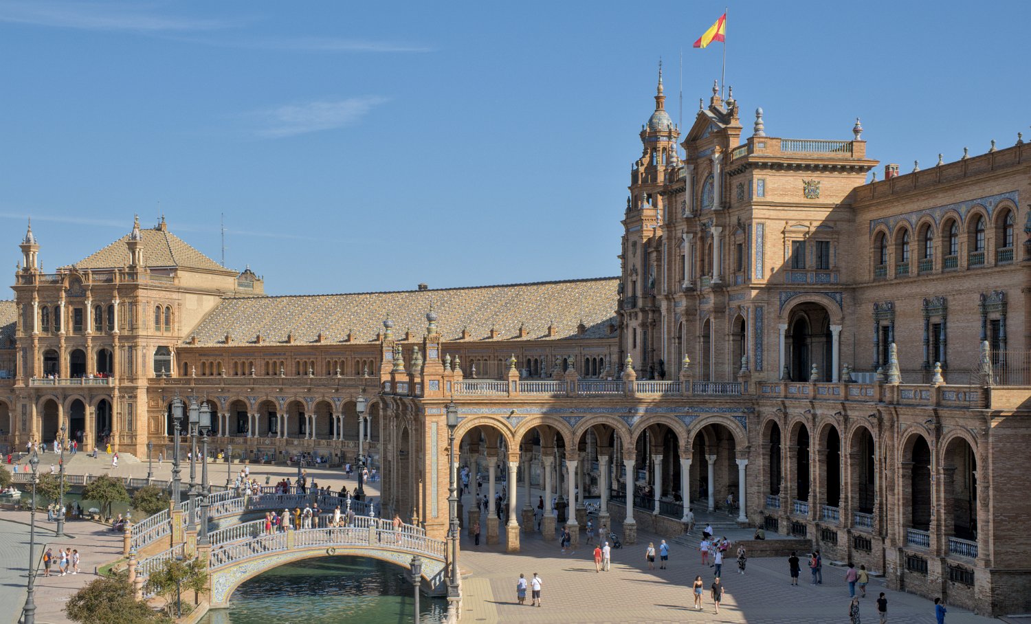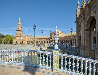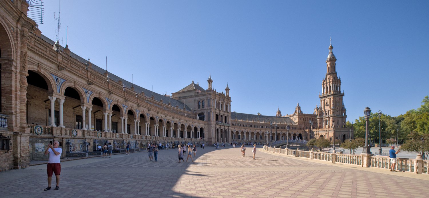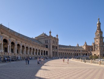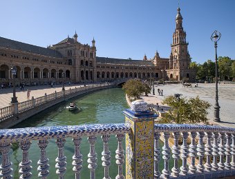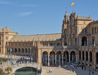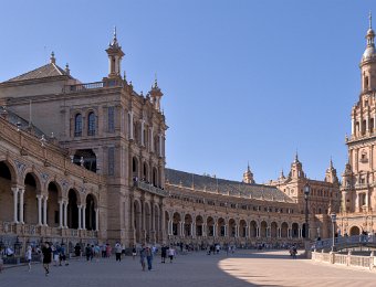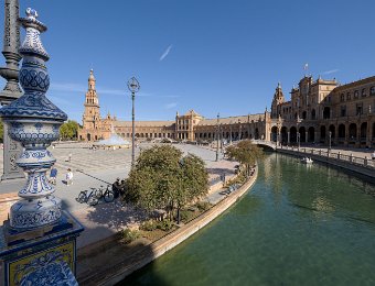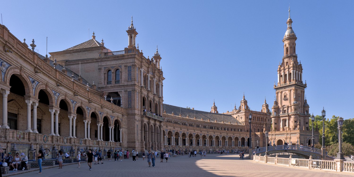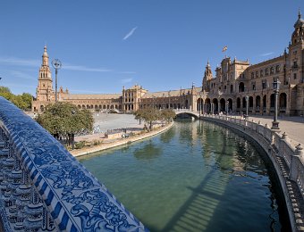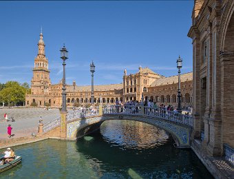La Place d'Espagne de Séville, conçue pour l'Exposition ibéro-américaine de 1929, est un magnifique exemple d'architecture régionale inspirée du style Renaissance et du baroque. Entourée d'un grand demi-cercle de bâtiments ornés de céramiques colorées, elle est traversée par un canal pittoresque et incarne la grandeur et la beauté de l'Espagne dans toute sa diversité régionale.