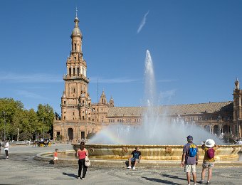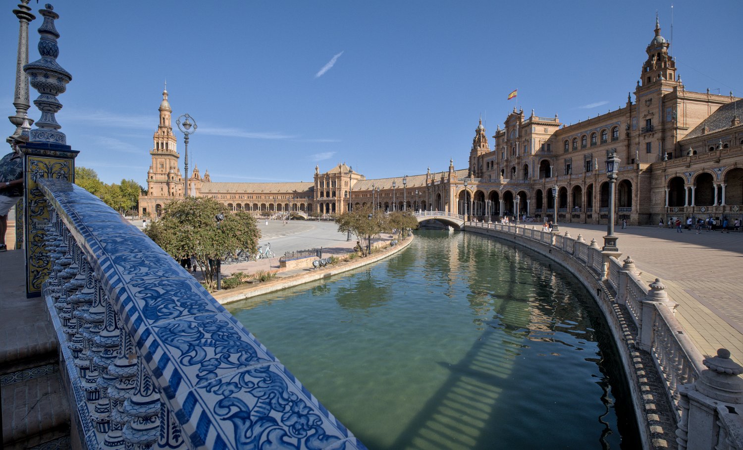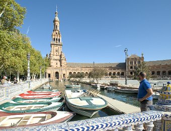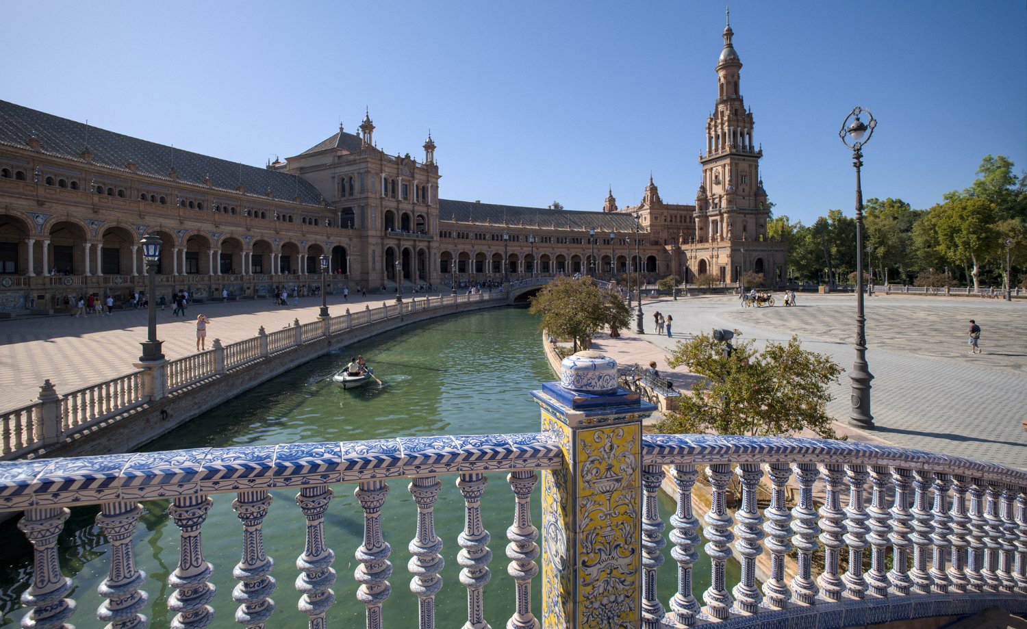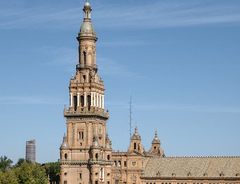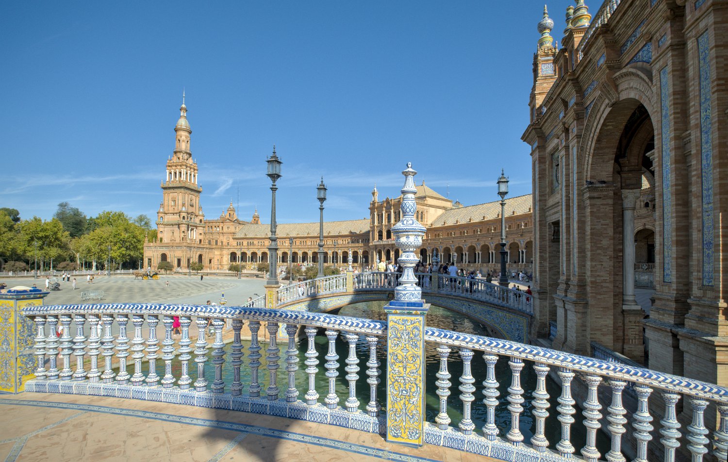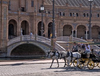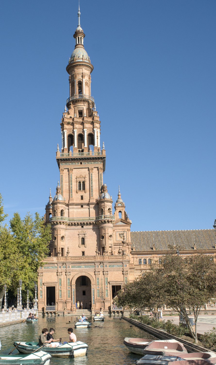 La Place d'Espagne de Séville, conçue pour l'Exposition ibéro-américaine de 1929, est un magnifique exemple d'architecture régionale inspirée du style Renaissance et du baroque. Entourée d'un grand demi-cercle de bâtiments ornés de céramiques colorées, elle est traversée par un canal pittoresque et incarne la grandeur et la beauté de l'Espagne dans toute sa diversité régionale.