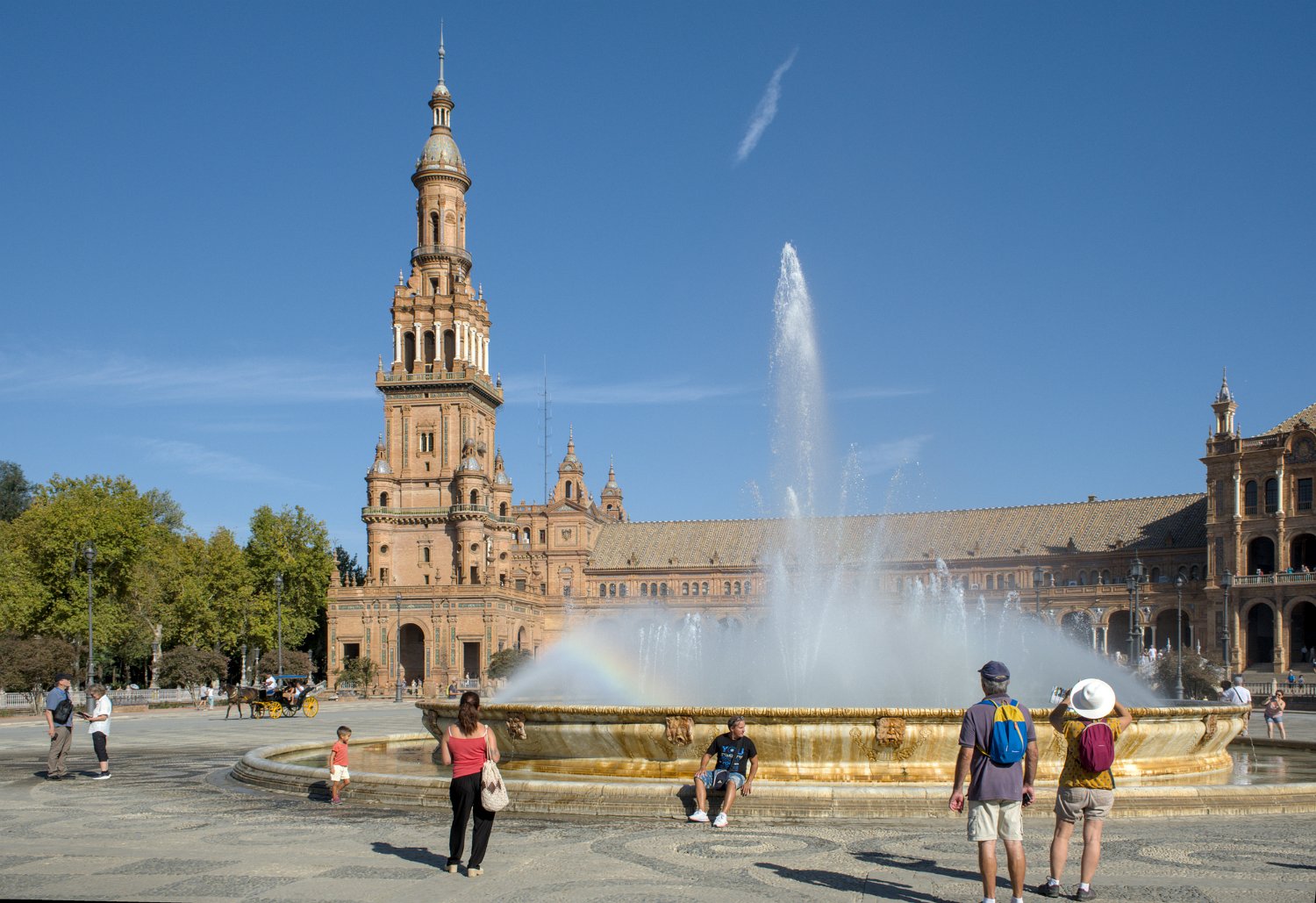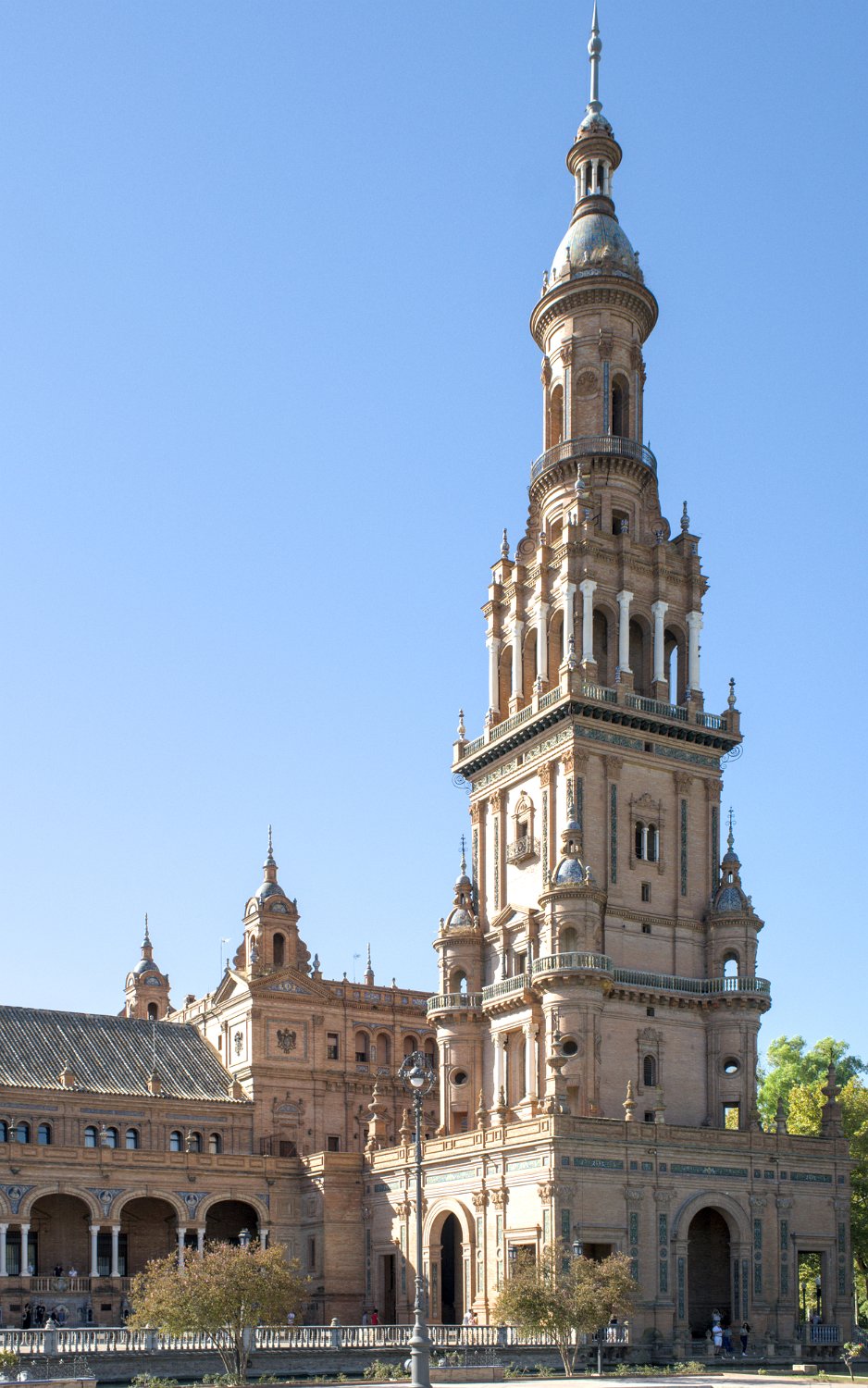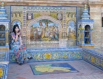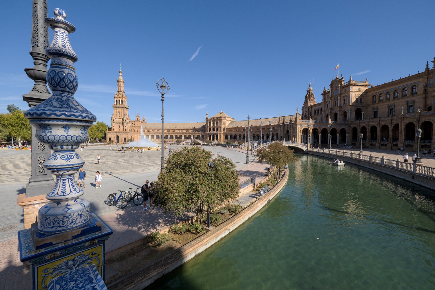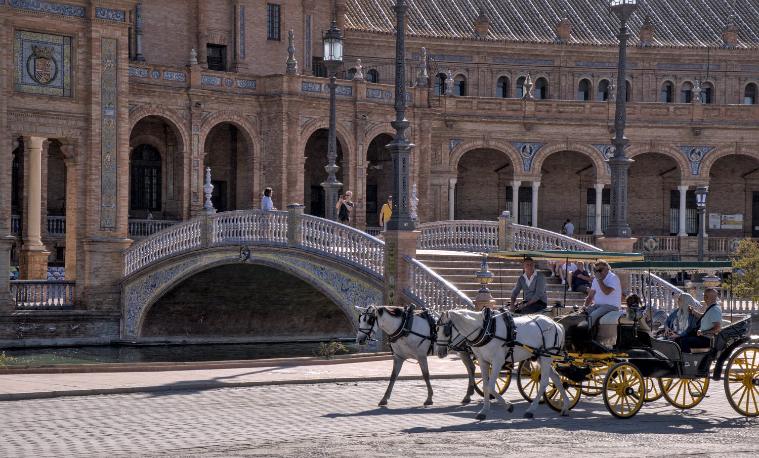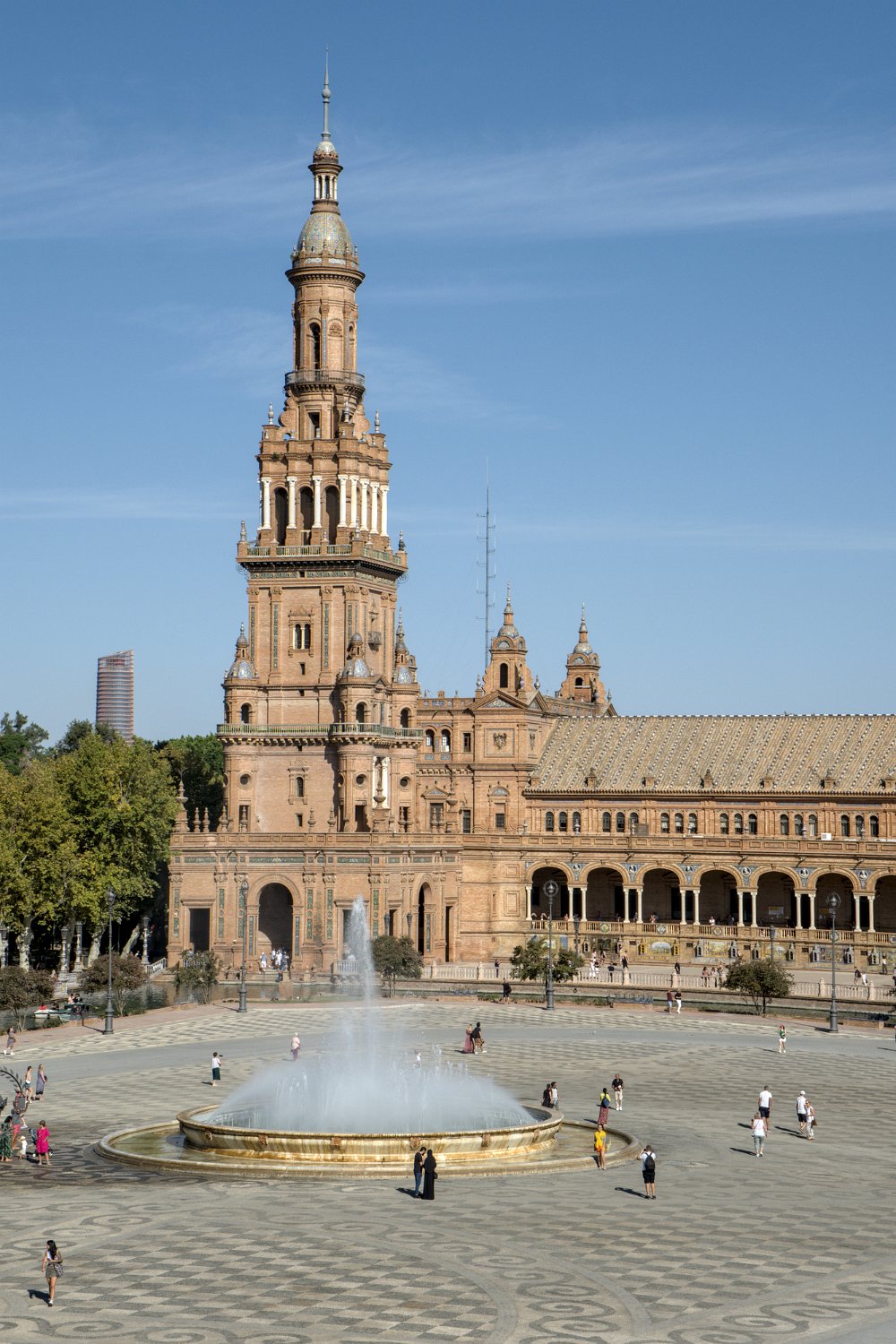 La Place d'Espagne de Séville, conçue pour l'Exposition ibéro-américaine de 1929, est un magnifique exemple d'architecture régionale inspirée du style Renaissance et du baroque. Entourée d'un grand demi-cercle de bâtiments ornés de céramiques colorées, elle est traversée par un canal pittoresque et incarne la grandeur et la beauté de l'Espagne dans toute sa diversité régionale.