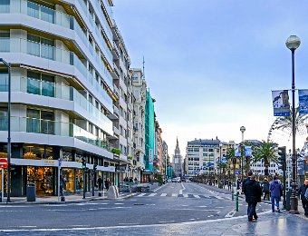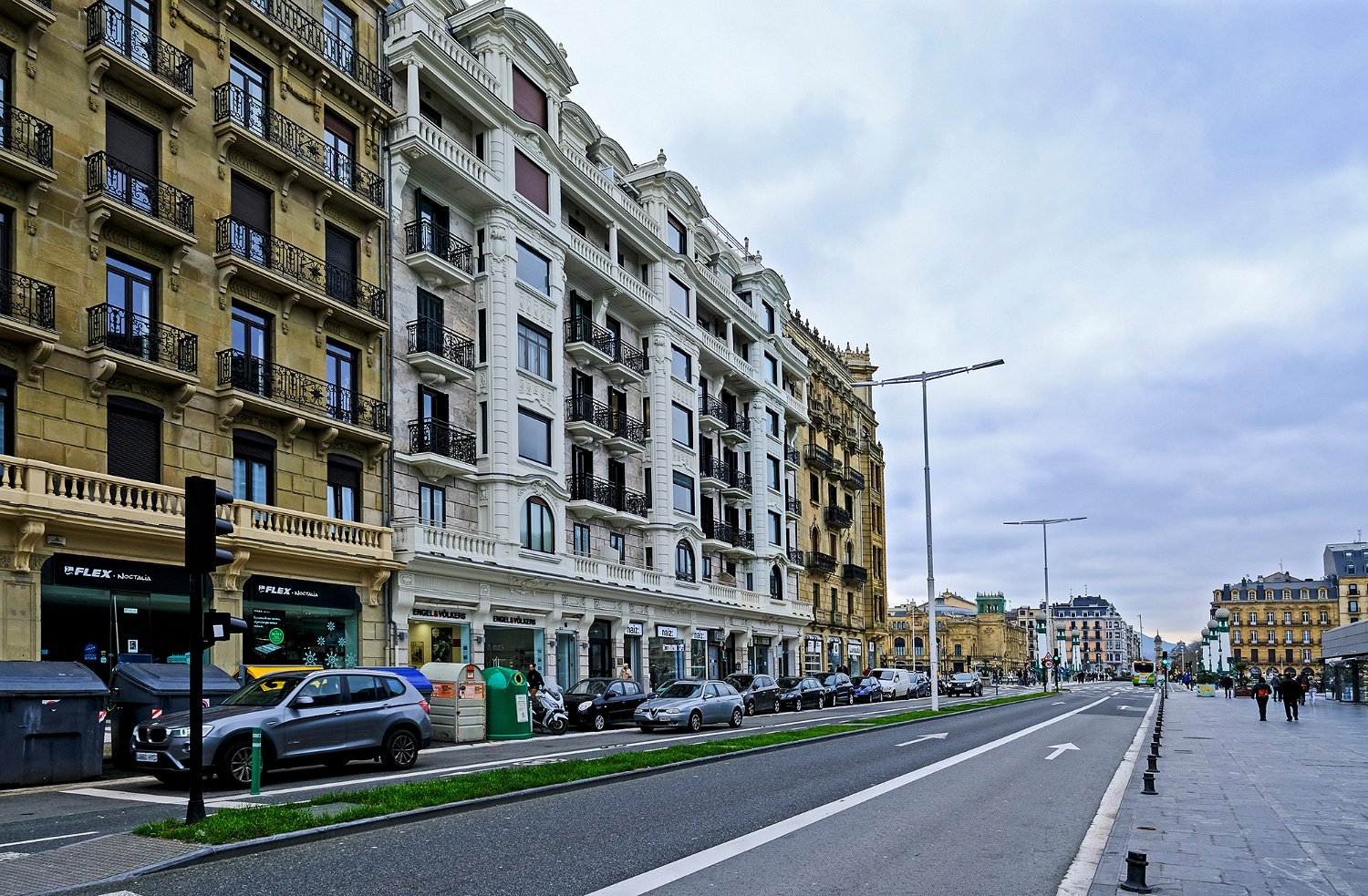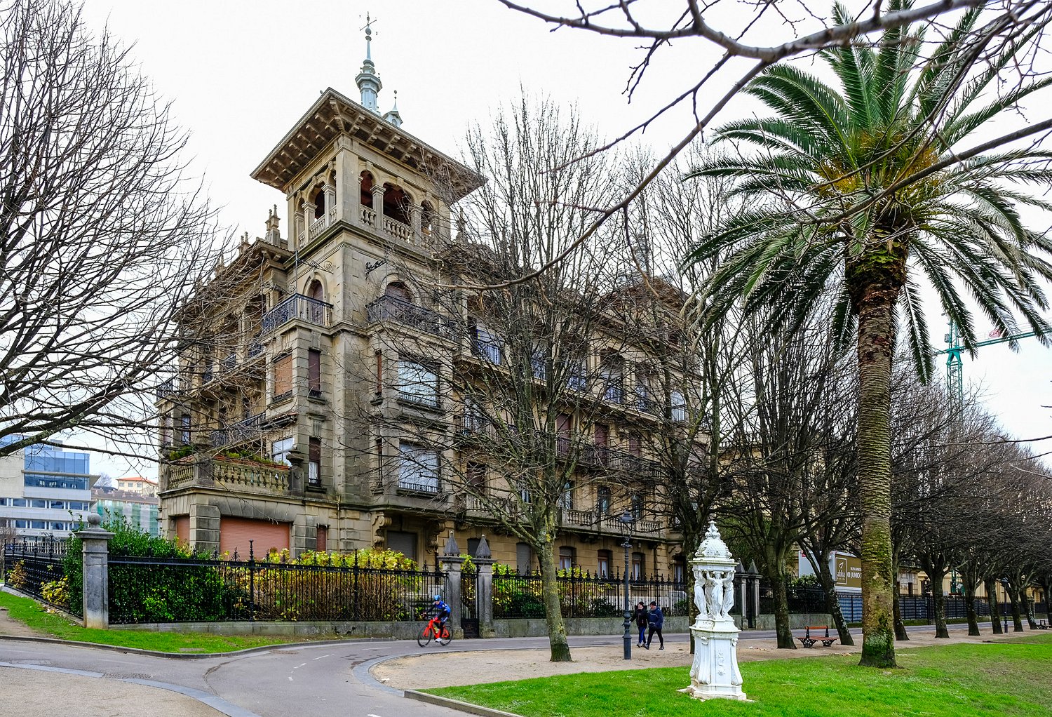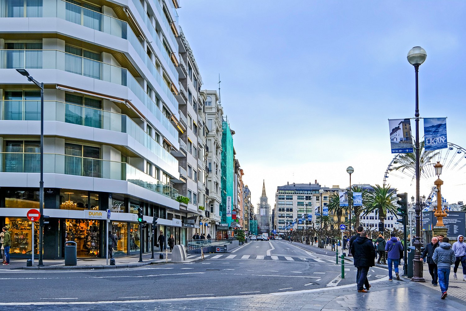 Avenue le long du jardin Alderdi Eder. Au fond la cathédrale del Buen Pastor en cours de rénovation