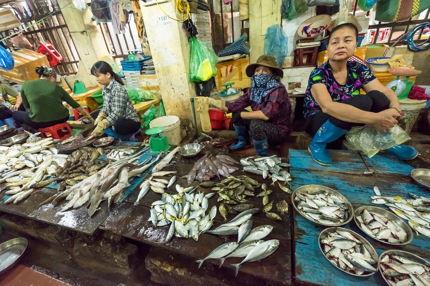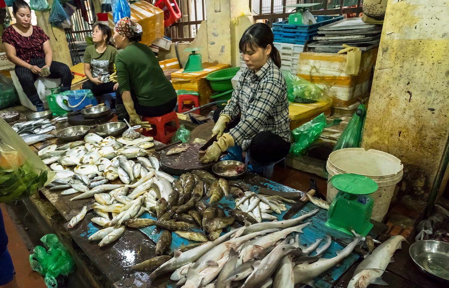 Produits de la mer au marché de Cat Ba ( crevettes mantes à gauche, poissons)
