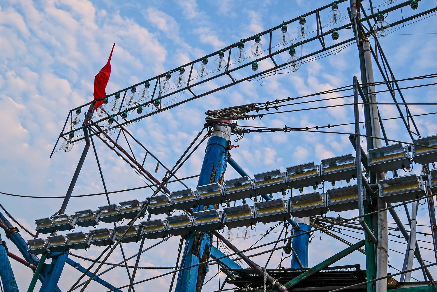 Bateau de pêche aux calmars verges déployées