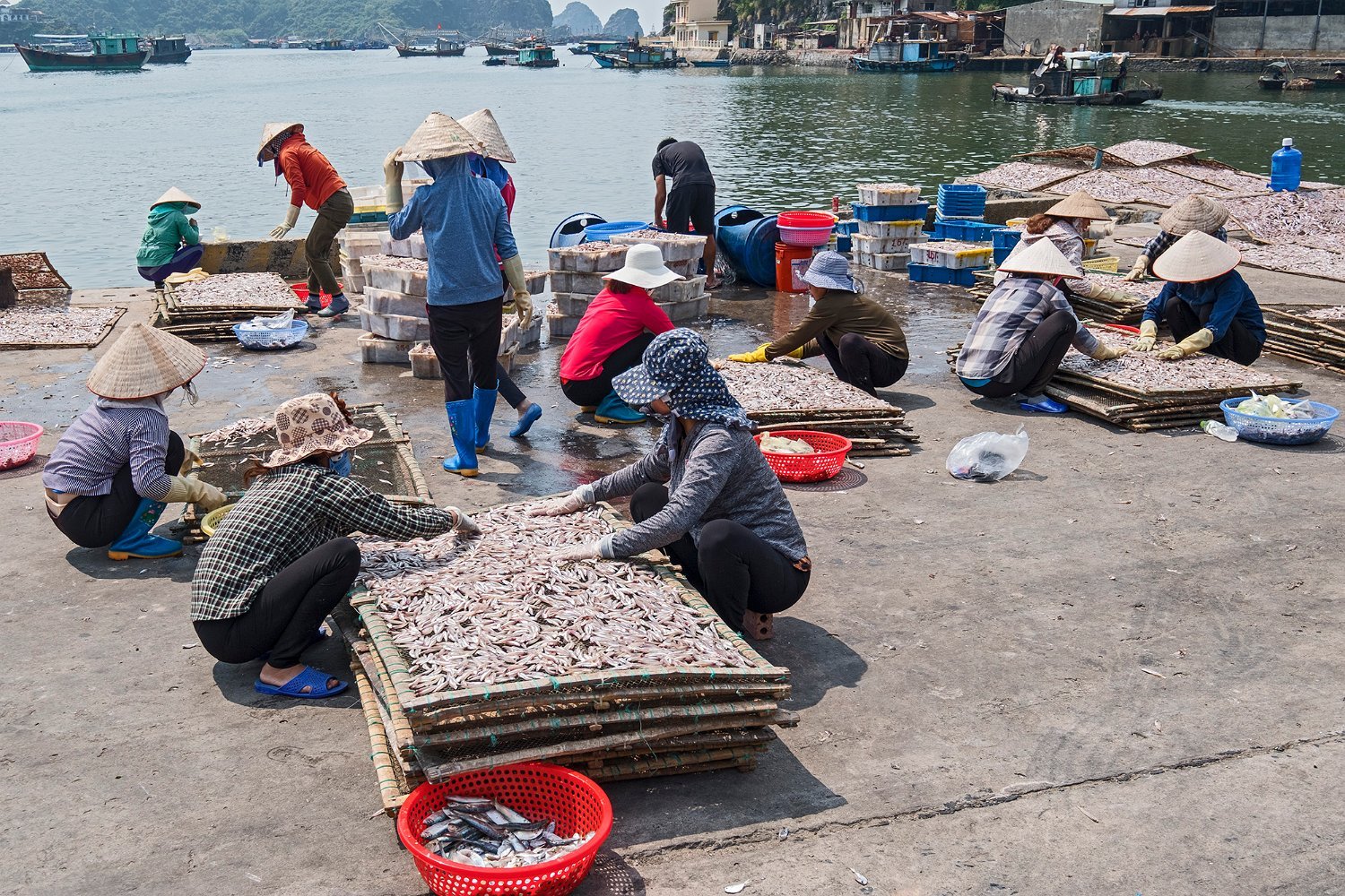 Lavage, tri et étalement des poissons sur des claies