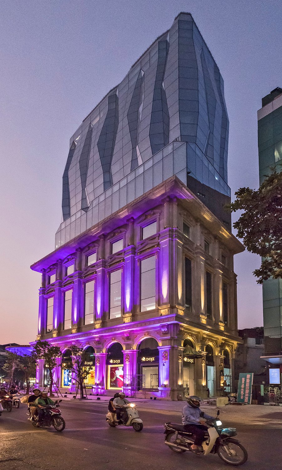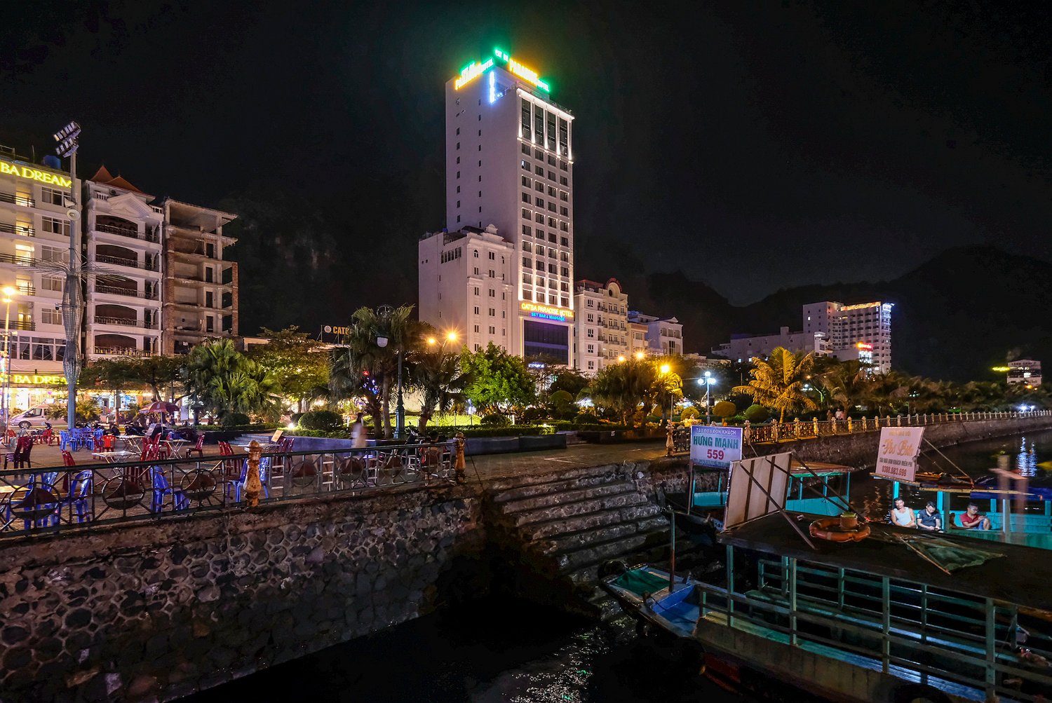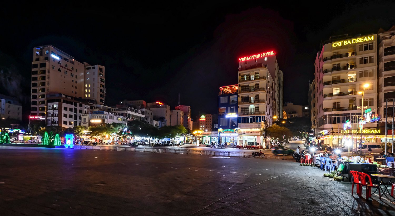 Vue nocturne sur le centre de la zone touristique Cat Ba de nuit. Au centre petit marché de nuit Cat Ba de nuit Immeuble moderne