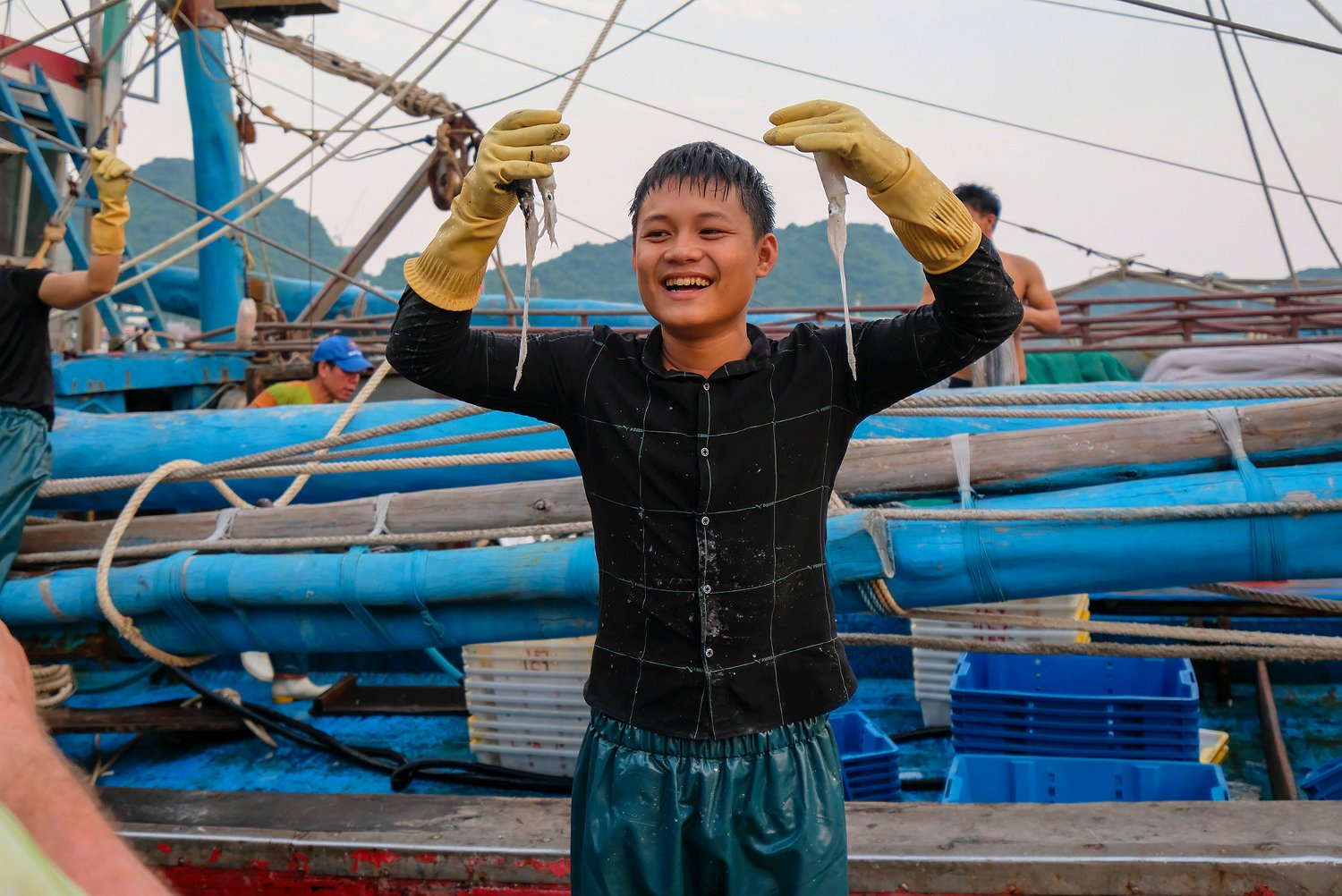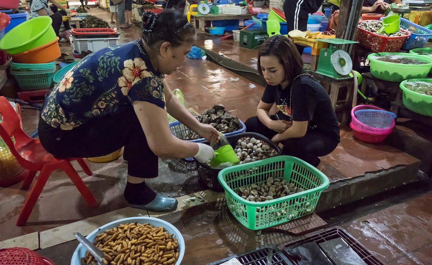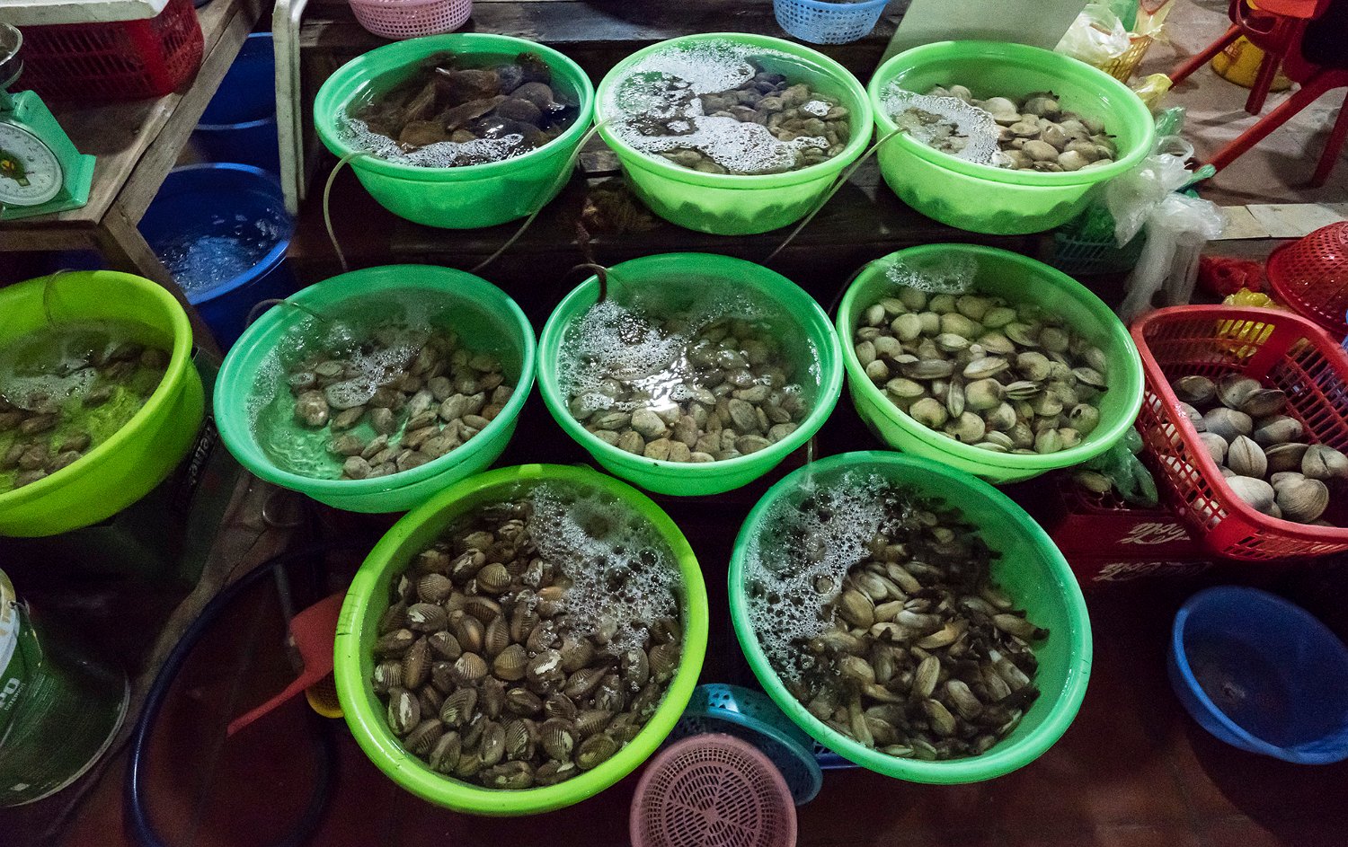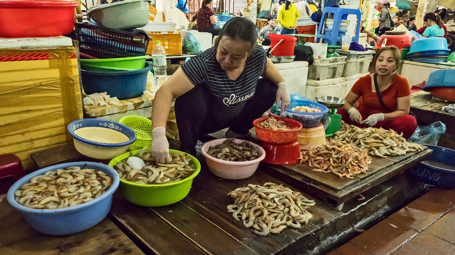 Calmar pêchés par les lamparos Produits de la mer  au marché de Cat Ba (coquillages) Produits de la mer  au marché de Cat Ba (coquillages et huitres) Produits de la mer  au marché de Cat Ba (crevettes)