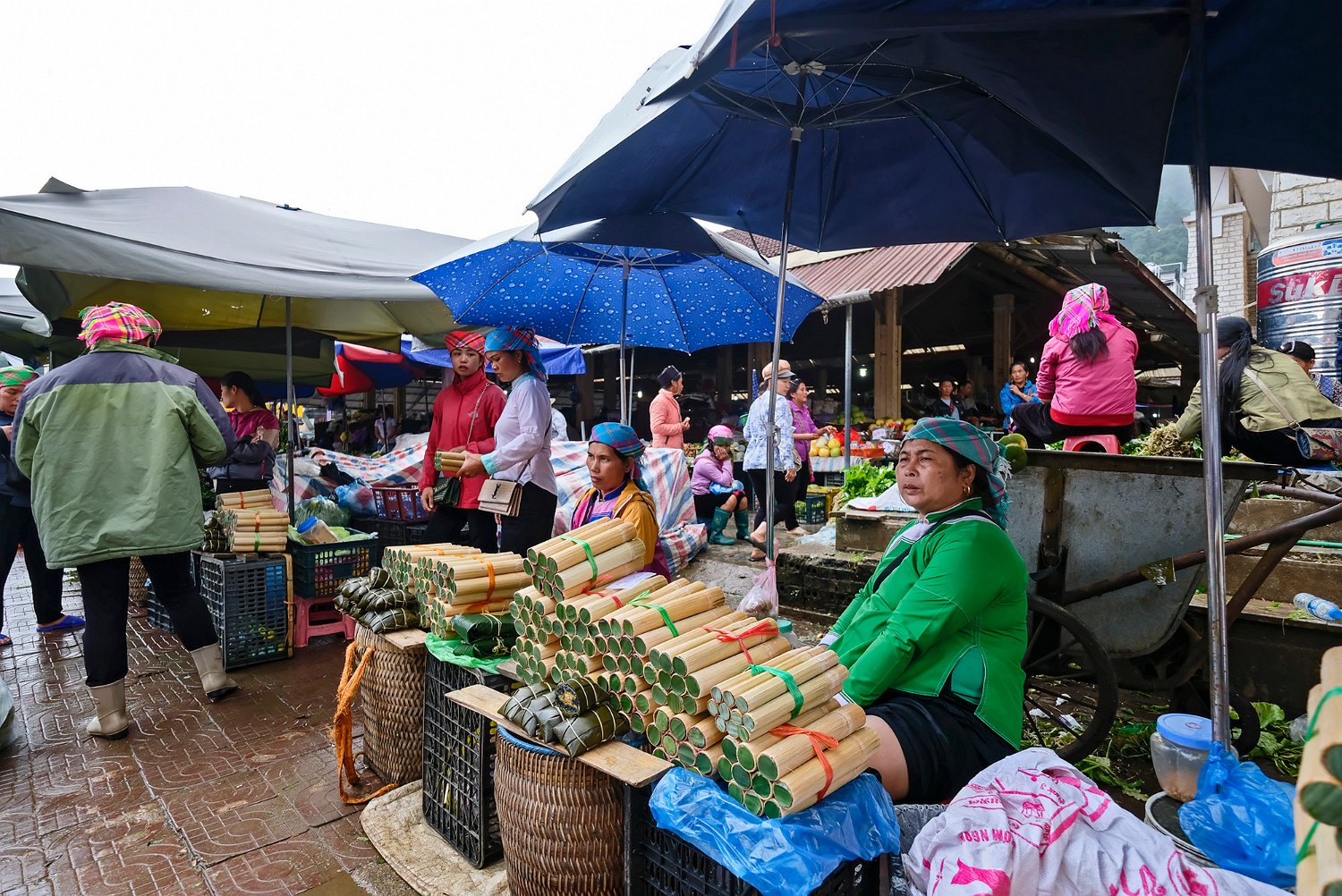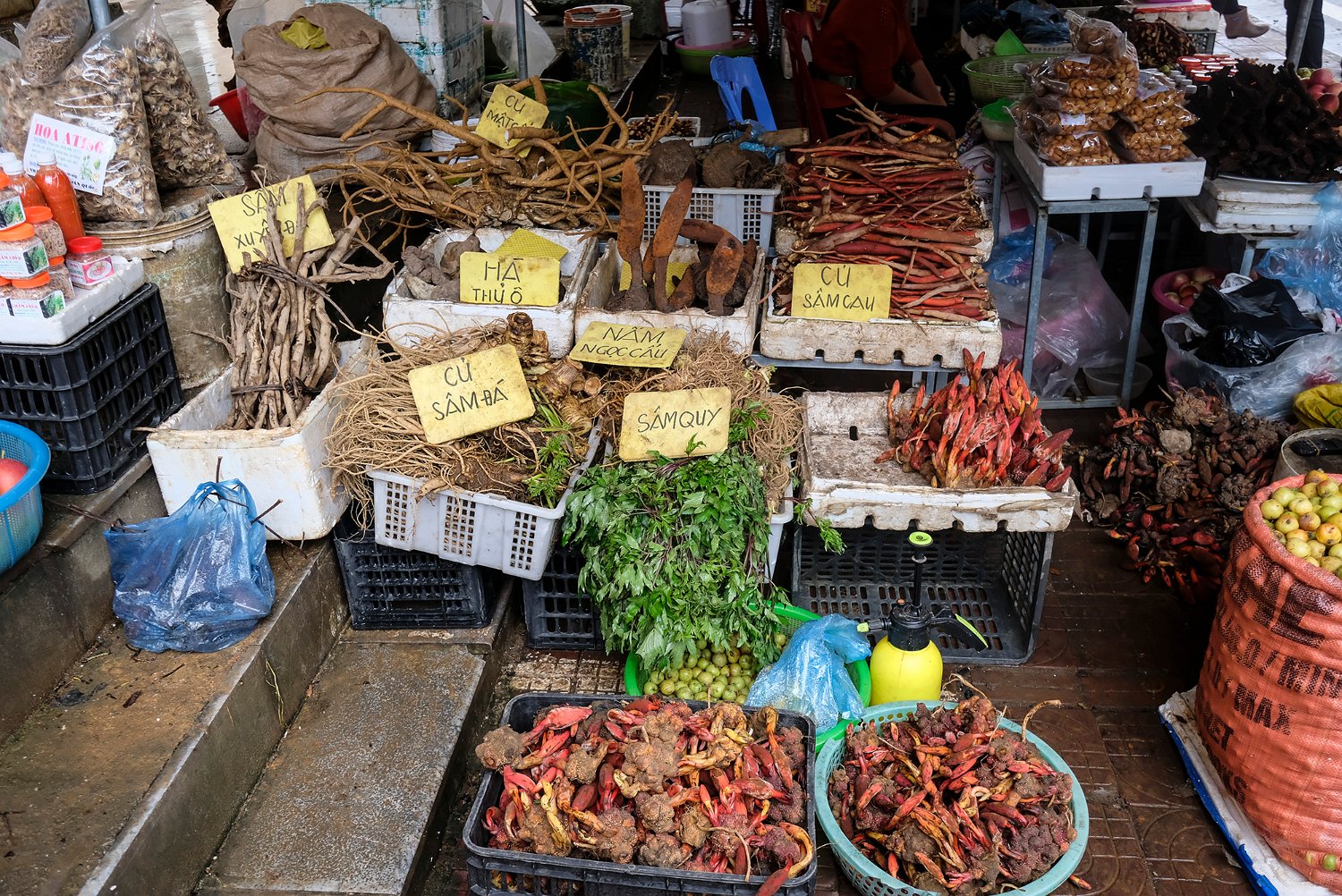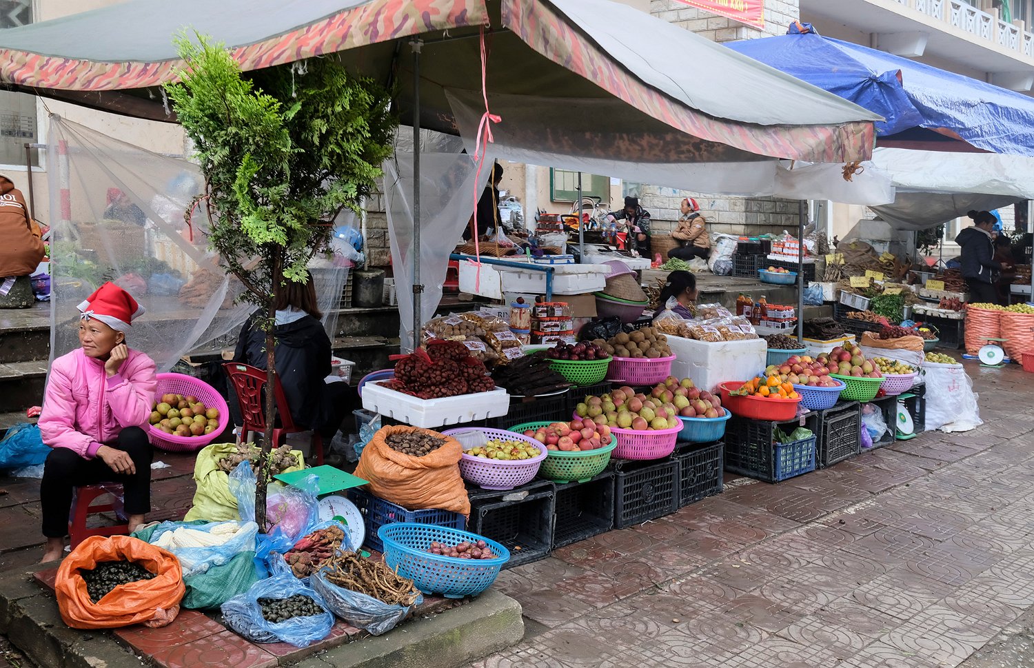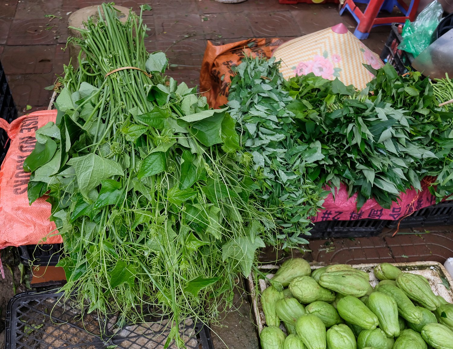 Champignon local non identifié La marché s'étend à l'extérieur du bâtiment Vente de fruits à l'extérieur du marché La chayotte est LE produit local de la région de Sapa. Les collines environnantes en sont couvertes
