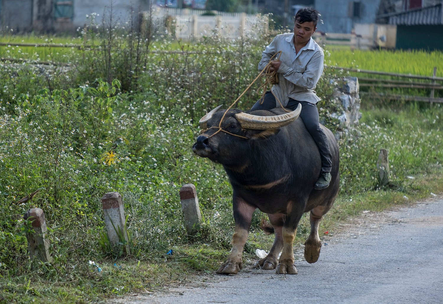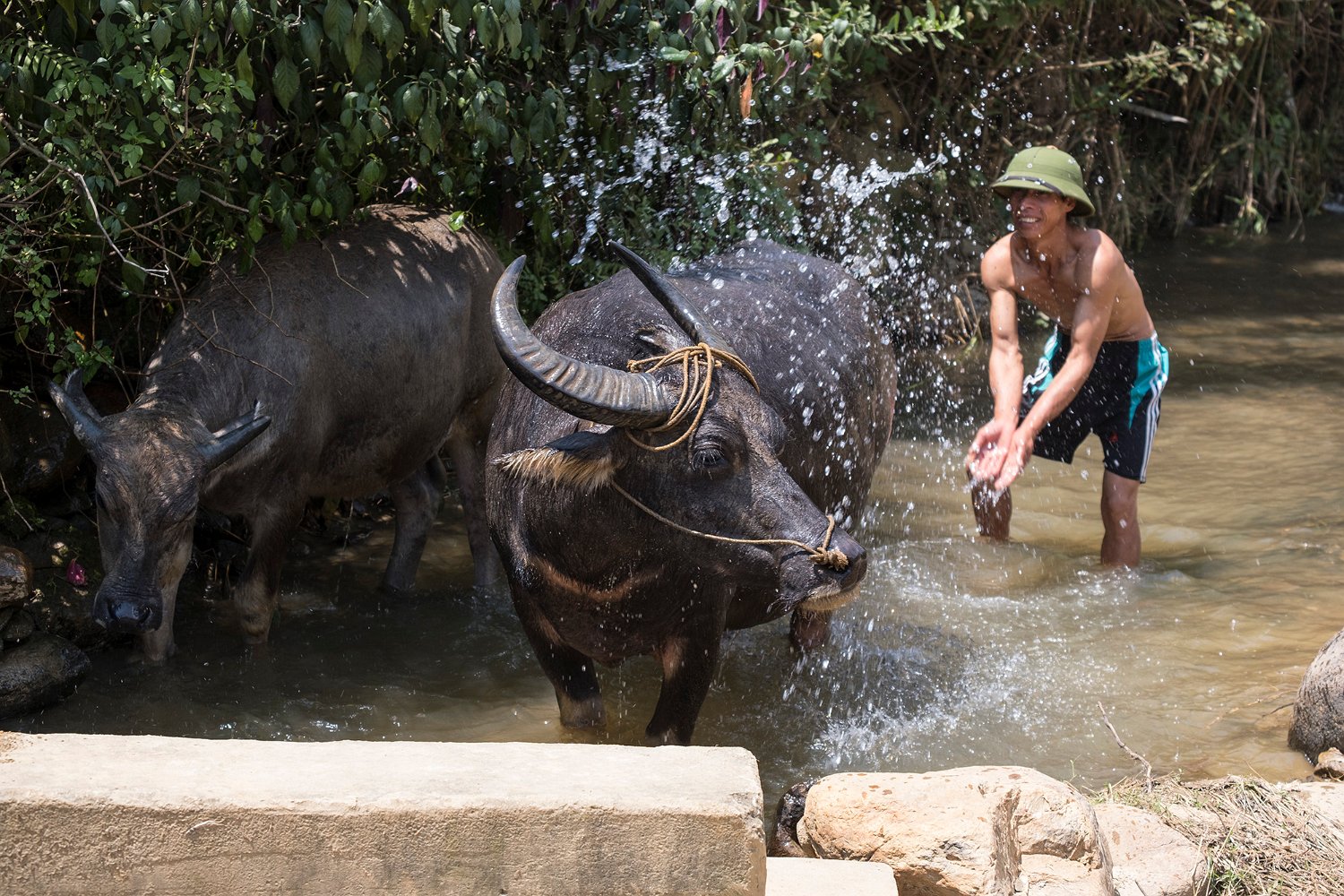 Paysan rafraîchissant ses buffles